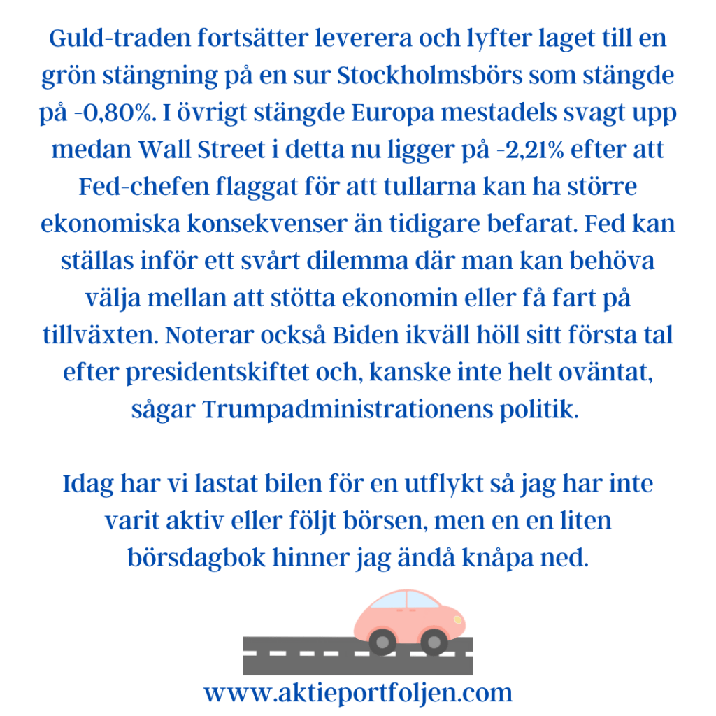 Guld-traden fortsätter leverera och lyfter laget till en grön stängning på en sur Stockholmsbörs som stängde på -0,80%. I övrigt stängde Europa mestadels svagt upp medan Wall Street i detta nu ligger på -2,21% efter att Fed-chefen flaggat för att tullarna kan ha större ekonomiska konsekvenser än tidigare befarat. Fed kan ställas inför ett svårt dilemma där man kan behöva välja mellan att stötta ekonomin eller få fart på tillväxten. Noterar också Biden ikväll höll sitt första tal efter presidentskiftet och, kanske inte helt oväntat, sågar Trumpadministrationens politik.
