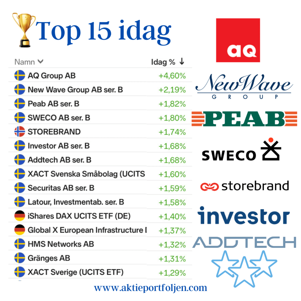 Dagens ledartröja gick till verkstadsbolaget AQ Group (+4,60%) som i fredags fick en höjd riktkurs av DNB Carnegie och aktien fortsatte upp idag.