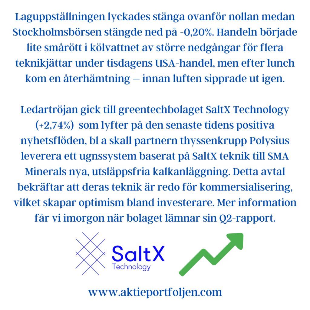 Laguppställningen lyckades stänga ovanför nollan medan Stockholmsbörsen stängde ned på -0,20%. Handeln började lite smårött i kölvattnet av större nedgångar för flera teknikjättar under tisdagens USA-handel, men efter lunch kom en återhämtning – innan luften sipprade ut igen.