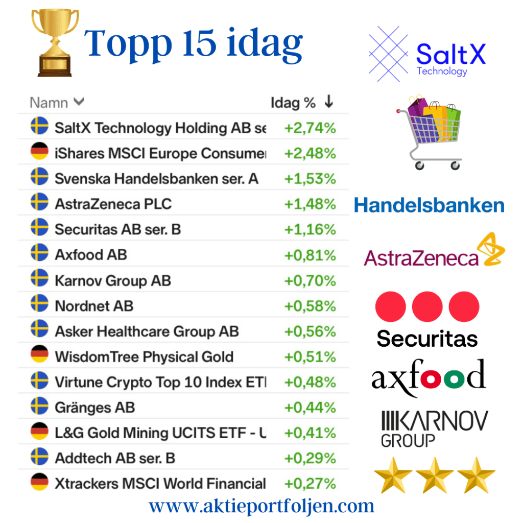 Handelsbanken (+1,53%) stängde som trea utan direkta nyheter. Noterar att kreditchefen fyllde på sitt innehav häromdagen, alltid positivt med insiderköp.