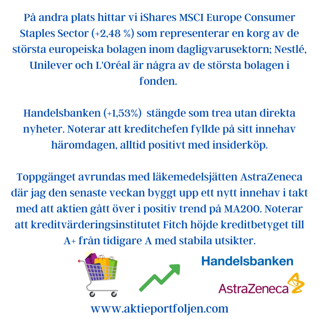 På andra plats hittar vi iShares MSCI Europe Consumer Staples Sector (+2,48 %) som representerar en korg av de största europeiska bolagen inom dagligvarusektorn; Nestlé, Unilever och L’Oréal är några av de största bolagen i fonden.