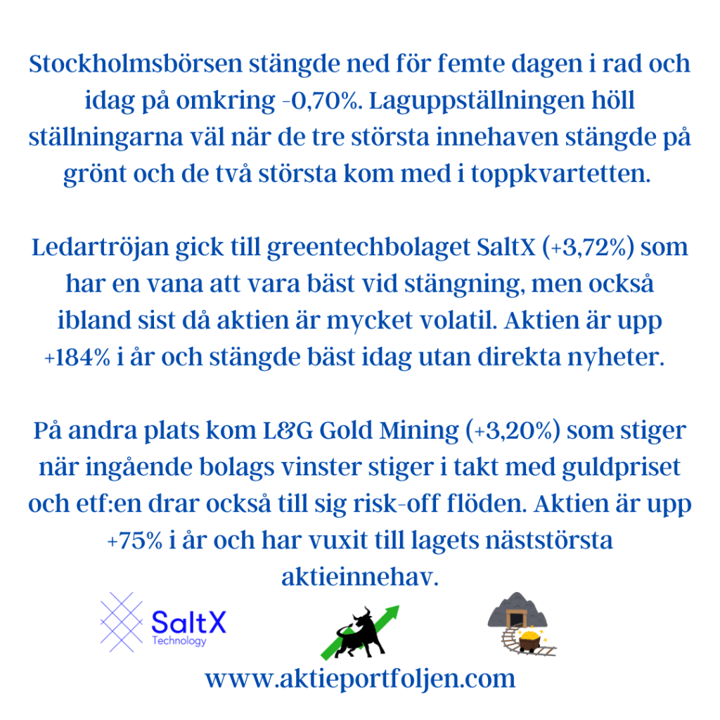 Ledartröjan gick till greentechbolaget SaltX (+3,72%) som har en vana att vara bäst vid stängning, men också ibland sist då aktien är mycket volatil. Aktien är upp +184% i år och stängde bäst idag utan direkta nyheter.