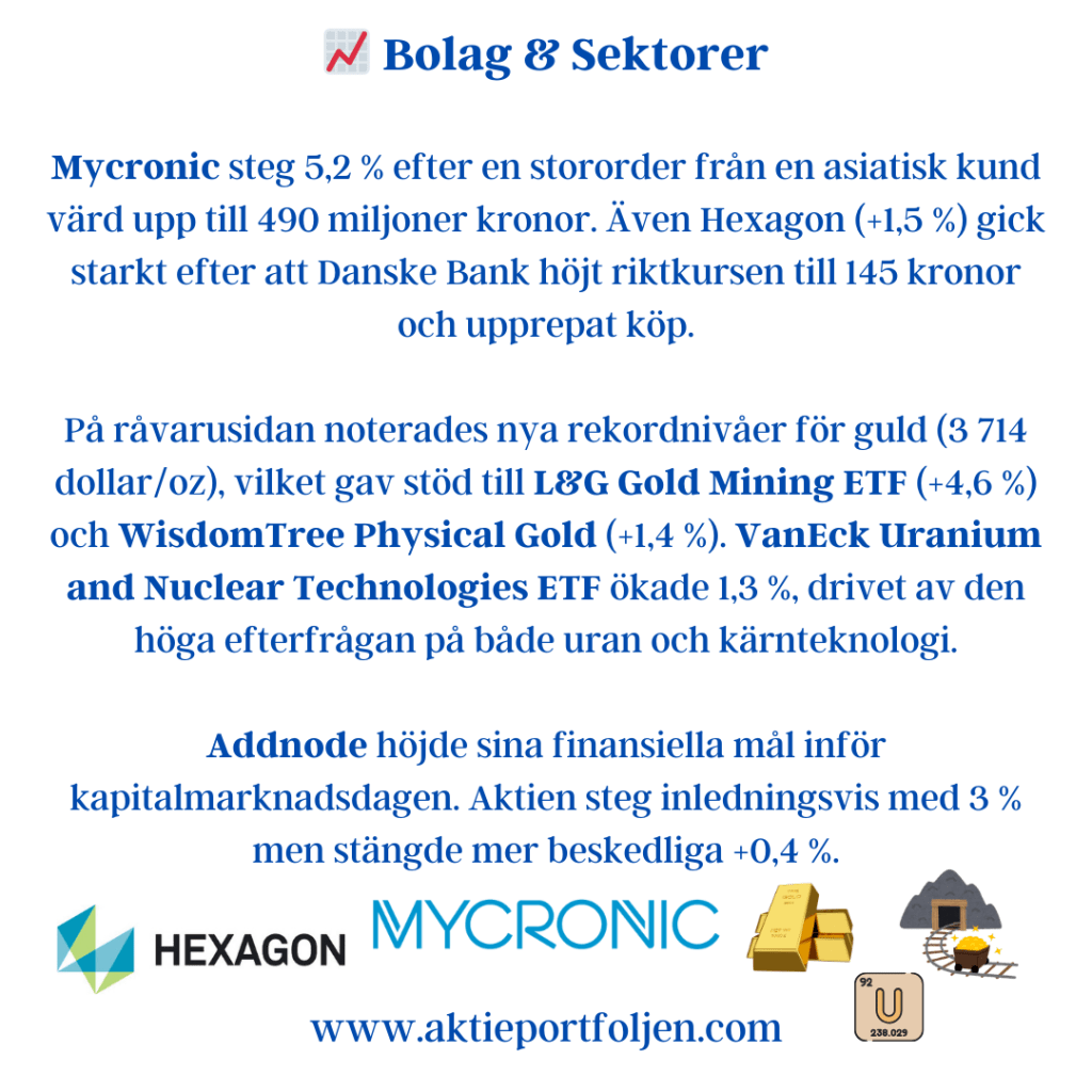 På råvarusidan noterades nya rekordnivåer för guld (3 714 dollar/oz), vilket gav stöd till L&G Gold Mining ETF (+4,6 %) och WisdomTree Physical Gold (+1,4 %). VanEck Uranium and Nuclear Technologies ETF ökade 1,3 %, drivet av den höga efterfrågan på både uran och kärnteknologi.