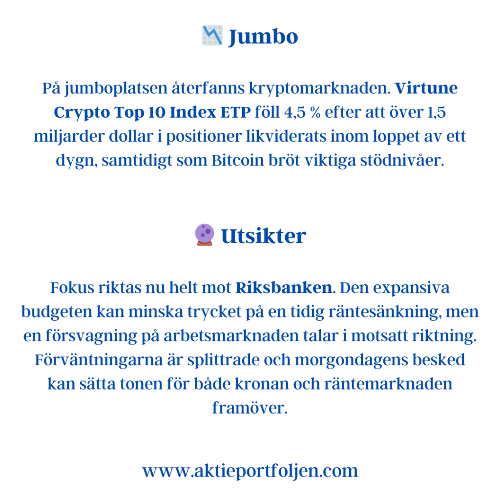 På jumboplatsen återfanns kryptomarknaden. Virtune Crypto Top 10 Index ETP föll 4,5 % efter att över 1,5 miljarder dollar i positioner likviderats inom loppet av ett dygn, samtidigt som Bitcoin bröt viktiga stödnivåer.