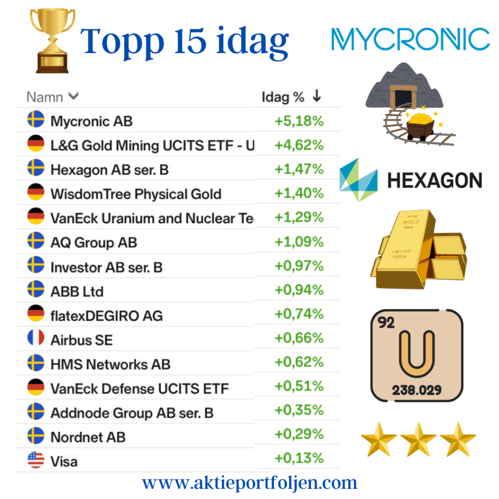 Mycronic AB +5,18 % – 229,65 L&G Gold Mining UCITS ETF – USD Acc +4,62 % – 77,96 Hexagon AB ser. B +1,47 % – 117,60 WisdomTree Physical Gold +1,40 % – 295,02 VanEck Uranium and Nuclear Technologies UCITS ETF +1,29 % – 50,15 AQ Group AB +1,09 % – 204,60 Investor AB ser. B +0,97 % – 286,70 ABB Ltd +0,94 % – 668,20 flatexDEGIRO AG +0,74 % – 27,40 Airbus SE +0,66 % – 195,14 HMS Networks AB +0,62 % – 455,20 VanEck Defense UCITS ETF +0,51 % – 52,94 Addnode Group AB ser. B +0,35 % – 116,00 Nordnet AB +0,29 % – 274,20 Visa +0,06 % – 341,80