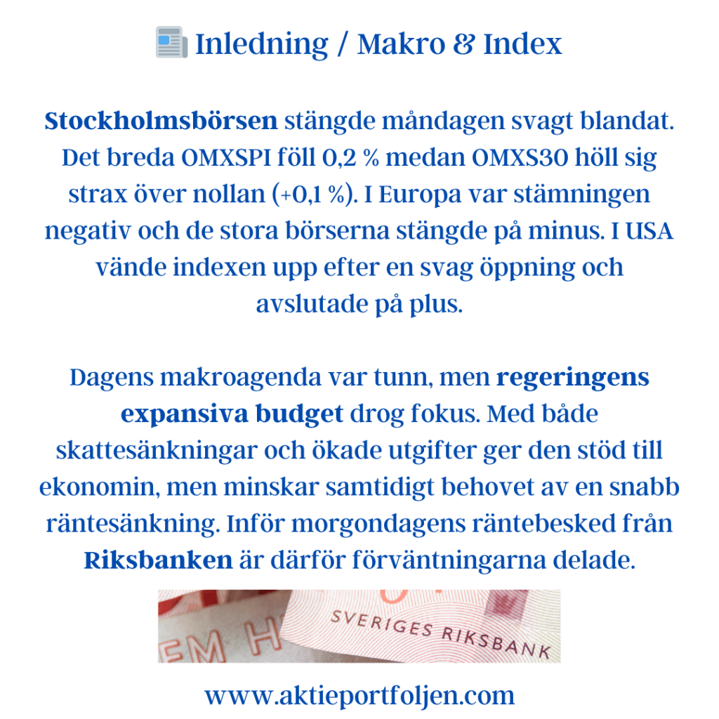 Dagens makroagenda var tunn, men regeringens expansiva budget drog fokus. Med både skattesänkningar och ökade utgifter ger den stöd till ekonomin, men minskar samtidigt behovet av en snabb räntesänkning. Inför morgondagens räntebesked från Riksbanken är därför förväntningarna delade.