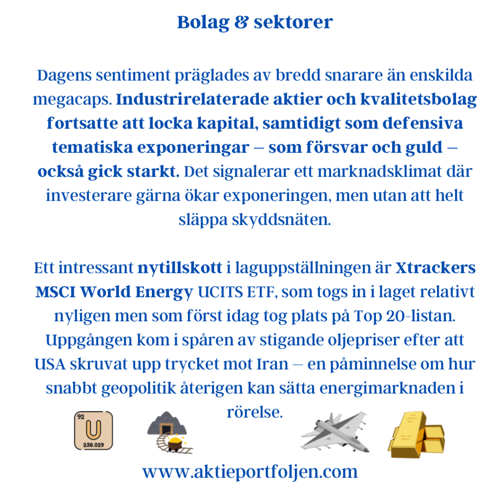 Dagens sentiment präglades av bredd snarare än enskilda megacaps. Industrirelaterade aktier och kvalitetsbolag fortsatte att locka kapital, samtidigt som defensiva tematiska exponeringar – som försvar och guld – också gick starkt. Det signalerar ett marknadsklimat där investerare gärna ökar exponeringen, men utan att helt släppa skyddsnäten.