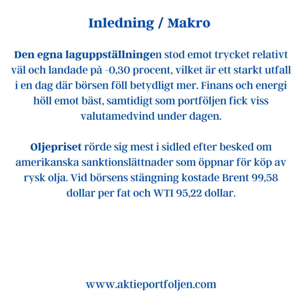 Den egna laguppställningen stod emot trycket relativt väl och landade på -0,30 procent, vilket är ett starkt utfall i en dag där börsen föll betydligt mer. Finans och energi höll emot bäst, samtidigt som portföljen fick viss valutamedvind under dagen.