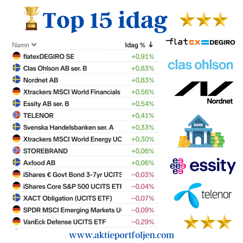 flatexDEGIRO +0,91% Clas Ohlson +0,83% Nordnet +0,83% Xtrackers MSCI World Financials +0,56% Essity +0,54% Telenor +0,41% Handelsbanken +0,33% Xtrackers MSCI World Energy +0,30% Storebrand +0,06% Axfood +0,06% iShares € Govt Bond 3–7yr -0,03% iShares Core S&P 500 -0,04% XACT Obligation -0,07% SPDR MSCI Emerging Markets -0,09% VanEck Defense -0,29%