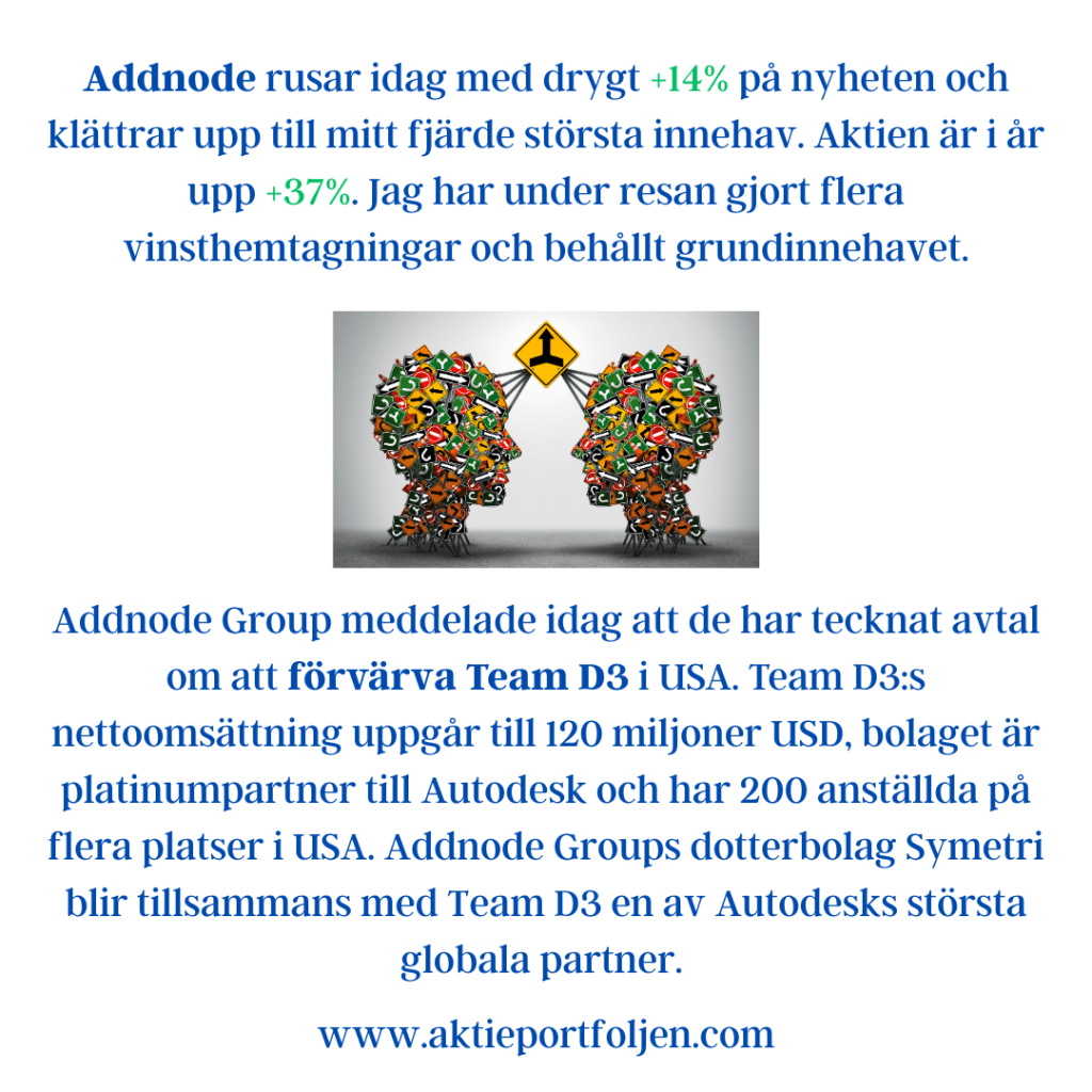 Addnode rusar idag med drygt +14% på nyheten och klättrar upp till mitt fjärde största innehav. Aktien är i år upp +37%. Jag har under resan gjort flera vinsthemtagningar och behållt grundinnehavet.