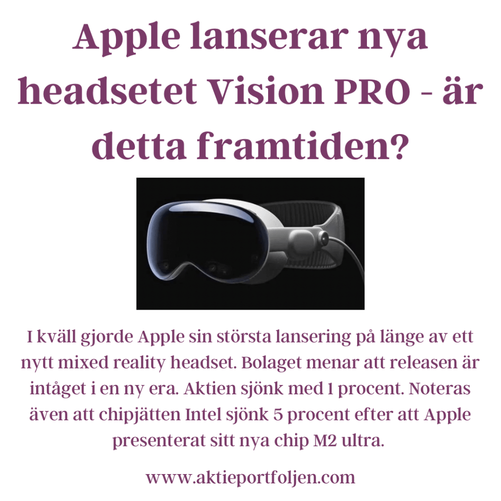 I kväll gjorde Apple sin största lansering på länge av ett nytt mixed reality headset. Bolaget menar att releasen är intåget i en ny era. Aktien sjönk med 1 procent. Noteras även att chipjätten Intel sjönk 5 procent efter att Apple presenterat sitt nya chip M2 ultra. Vision Pro är Apples första headset som är skräddarsydd för augmentet reality, ar. Det är ett par glasögon som blandar användarens synfält med digitala bilder och ljud. Det har en ny visionOS och en R1-chip som gör det möjligt att styra headsetet med rösten, handrörelser eller en touchpad på sidan. Vision Pro kostar 3 499 dollar och kommer att finnas tillgänglig tidigt nästa år. Det har en upplösning på 8K per öga och en synvinkel på 120 grader. Det har också 12 kameror för att spåra användarens rörelser och omgivning. Med Vision Pro kan du göra många saker som att spela spel, titta på filmer, arbeta, lära dig och socialisera i en förstärkt verklighet. Du kan också använda Apples appar som Safari, Maps, Photos, Music och Messages på ett nytt sätt. En unik funktion med Vision Pro är att den visar dina ögon till dem runt dig genom en teknik som kallas EyeSight. Detta gör att du kan ge viktiga signaler till andra om vad du fokuserar på och skapa mer mänskliga interaktioner. Om du till exempel tittar på någon som också har Vision Pro på sig, kommer du att se deras ögon och de kommer att se dina. Är Apples headset framtiden? Priset lär avskräcka en och annan. Jag och många andra bländas av tekniken medan andra tittar mest på priset. Under kvällen när headsetet presenterades skapades många memes på sociala medier utifrån känslan av att inte ha råd att köpa headsetet. Men nu vet vi hur Apple tror att vi vill uppleva framtidens digitala världar. Själv är jag övertygad om att headsetet kommer att revolutionera hur vi interagerar med teknik och varandra.