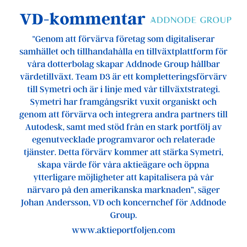 ”Genom att förvärva företag som digitaliserar samhället och tillhandahålla en tillväxtplattform för våra dotterbolag skapar Addnode Group hållbar värdetillväxt. Team D3 är ett kompletteringsförvärv till Symetri och är i linje med vår tillväxtstrategi. Symetri har framgångsrikt vuxit organiskt och genom att förvärva och integrera andra partners till Autodesk, samt med stöd från en stark portfölj av egenutvecklade programvaror och relaterade tjänster. Detta förvärv kommer att stärka Symetri, skapa värde för våra aktieägare och öppna ytterligare möjligheter att kapitalisera på vår närvaro på den amerikanska marknaden”, säger Johan Andersson, VD och koncernchef för Addnode Group.