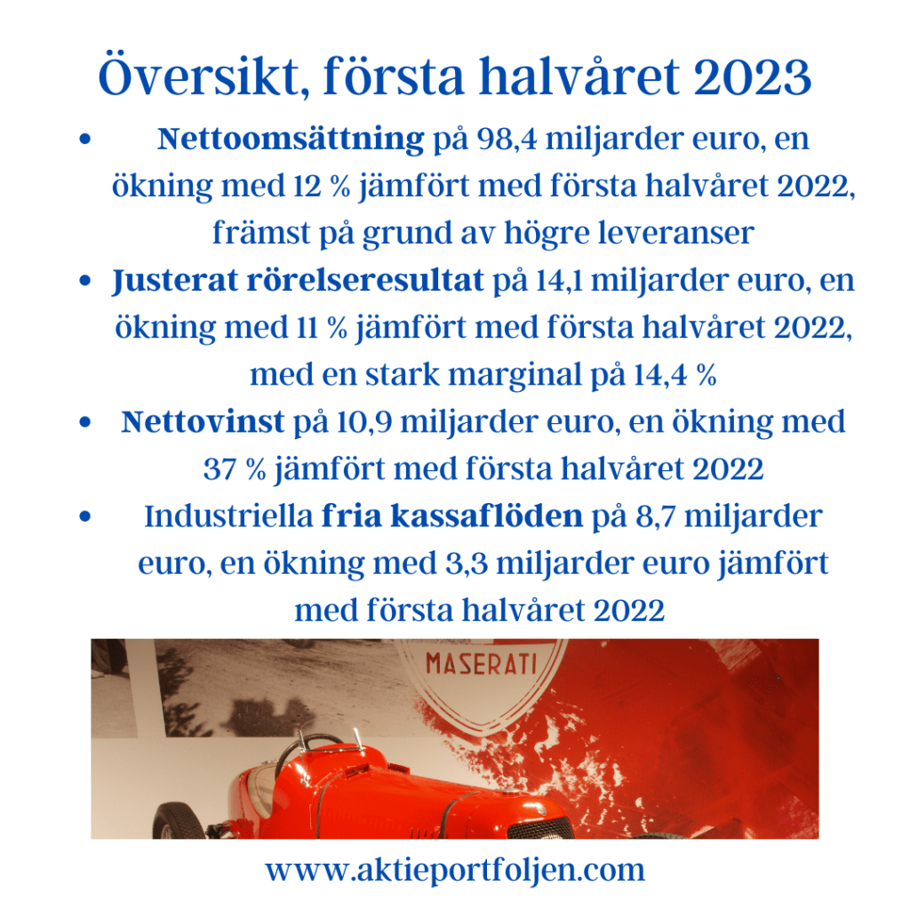Tillverkaren av Maserati, Jeep, Chrysler, Alfa Romeo, Citroen m fl bilmärken rapporterade idag rekordresultat för första halvåret 2023, förstärkta av förbättrade leveranser av halvledare jämfört med 2022. Aktien är upp 28% i år och stiger med +1,74% på rapporten. Direktavkastningen ligger på 6-7%. Inläggets källa är Stellantis halvårsrapport.