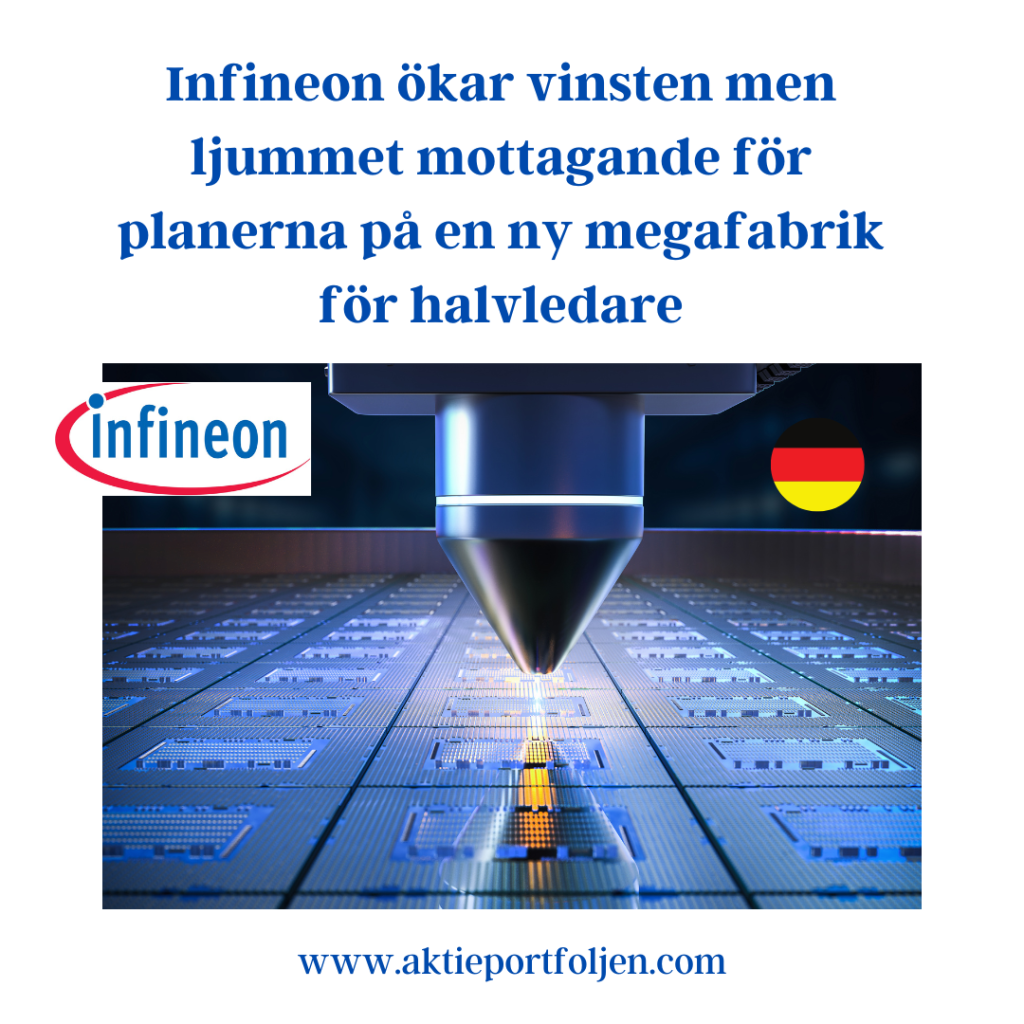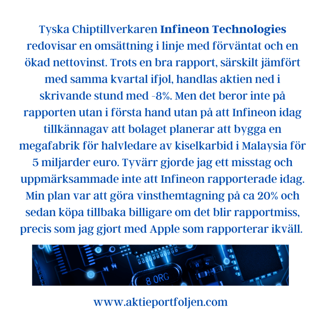 Tyska Chiptillverkaren Infineon Technologies redovisar en omsättning i linje med förväntat och en ökad nettovinst. Trots en bra rapport, särskilt jämfört med samma kvartal ifjol, handlas aktien ned i skrivande stund med -8%. Men det beror inte på rapporten utan i första hand utan på att Infineon idag tillkännagav att bolaget planerar att bygga en megafabrik för halvledare av kiselkarbid i Malaysia för 5 miljarder euro. Tyvärr gjorde jag ett misstag och uppmärksammade inte att Infineon rapporterade idag. Min plan var att göra vinsthemtagning på ca 20% och sedan köpa tillbaka billigare om det blir rapportmiss, precis som jag gjort med Apple som rapporterar ikväll.