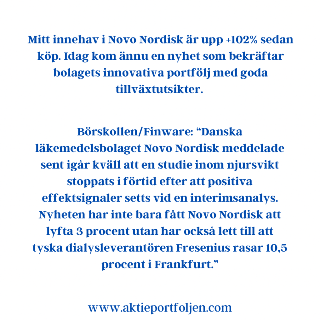 Mitt innehav i Novo Nordisk är upp +102% sedan köp. Idag kom ännu en nyhet som bekräftar bolagets innovativa portfölj med goda tillväxtutsikter. Börskollen/Finware: “Danska läkemedelsbolaget Novo Nordisk meddelade sent igår kväll att en studie inom njursvikt stoppats i förtid efter att positiva effektsignaler setts vid en interimsanalys. Nyheten har inte bara fått Novo Nordisk att lyfta 3 procent utan har också lett till att tyska dialysleverantören Fresenius rasar 10,5 procent i Frankfurt.”