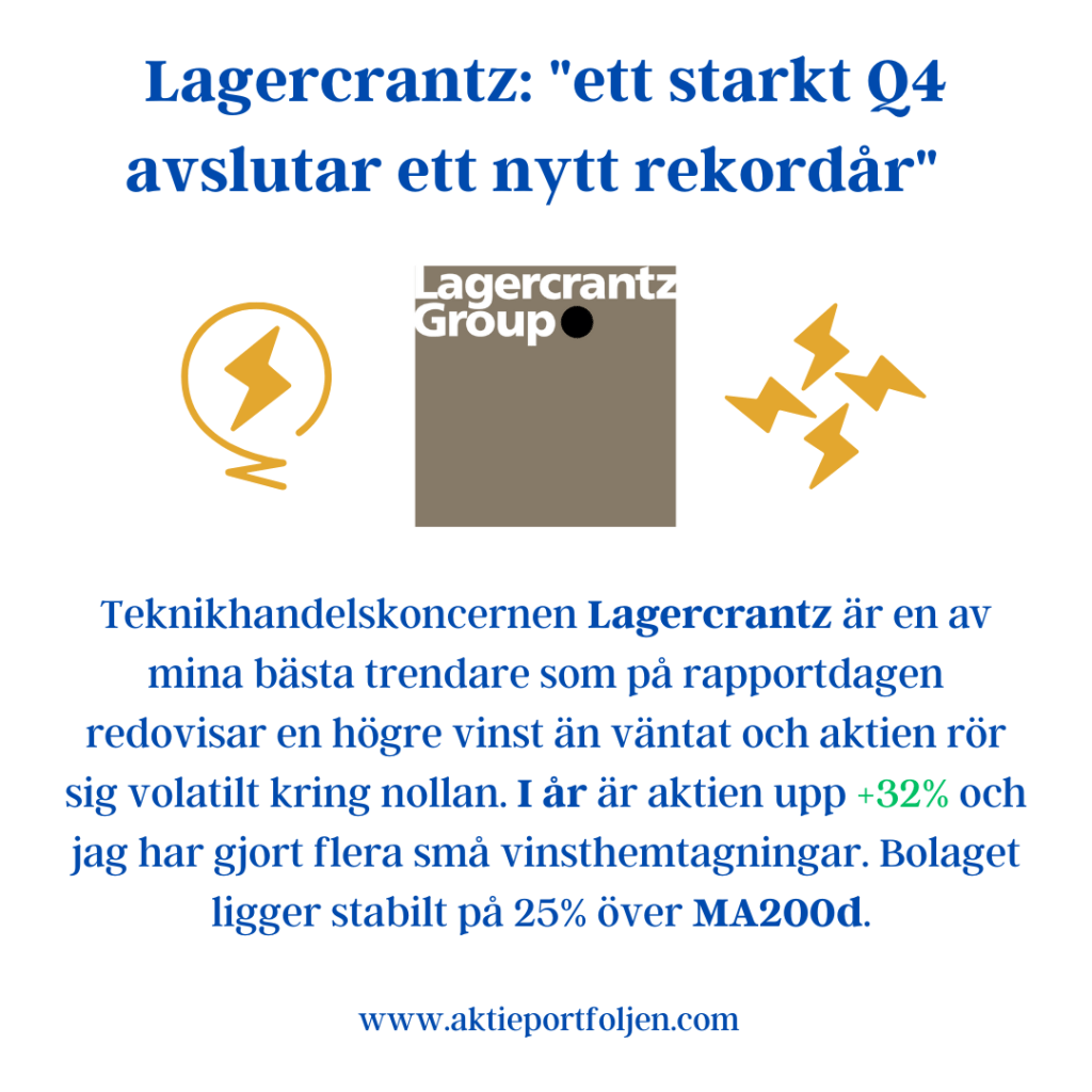 Teknikhandelskoncernen Lagercrantz är en av mina bästa trendare som på rapportdagen redovisar en högre vinst än väntat och aktien rör sig volatilt kring nollan. I år är aktien upp +32% och jag har gjort flera små vinsthemtagningar. Bolaget ligger stabilt på 25% över MA200d.