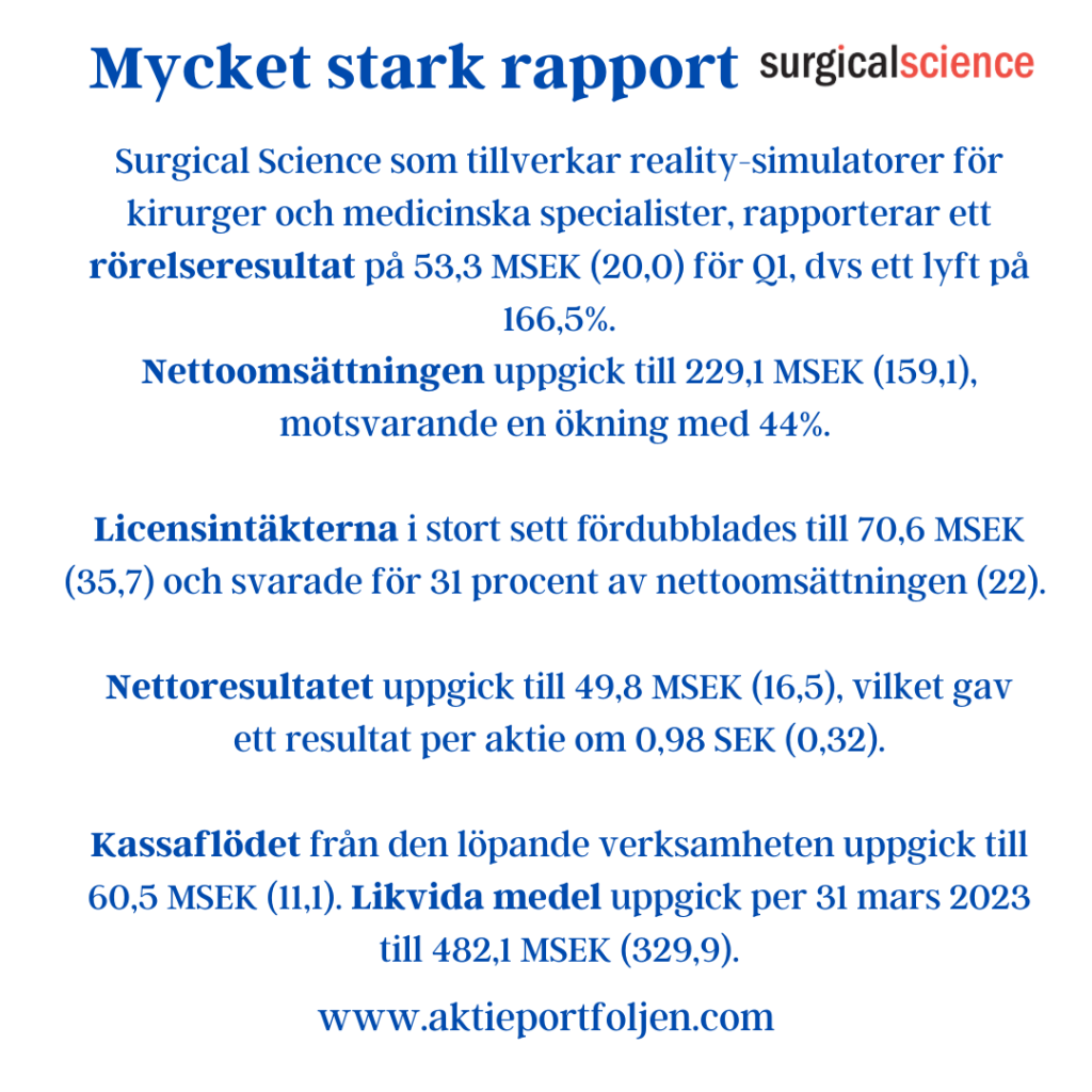”Surgical Science hade en mycket stark start på 2023. Omsättningen växte över 40% vilket innebär 70 MSEK mer i försäljning jämfört med samma period föregående år. Av 229 MSEK i total försäljning genererar vi en rörelsevinst på över 50 MSEK vilket är drygt 2,5 gånger mer än vinsten under första kvartalet 2022. Licensintäkterna från våra robotkirurgikunder fördubblades jämfört med första kvartalet 2022. Övriga nyckeltal pekar också i rätt rikt- ning inklusive ett fortsatt starkt kassaflöde. Makroekonomin ger anledning till farhågor om sämre tider men än så länge ser vi inte att det påverkat vår verksamhet i någon större utsträckning.”