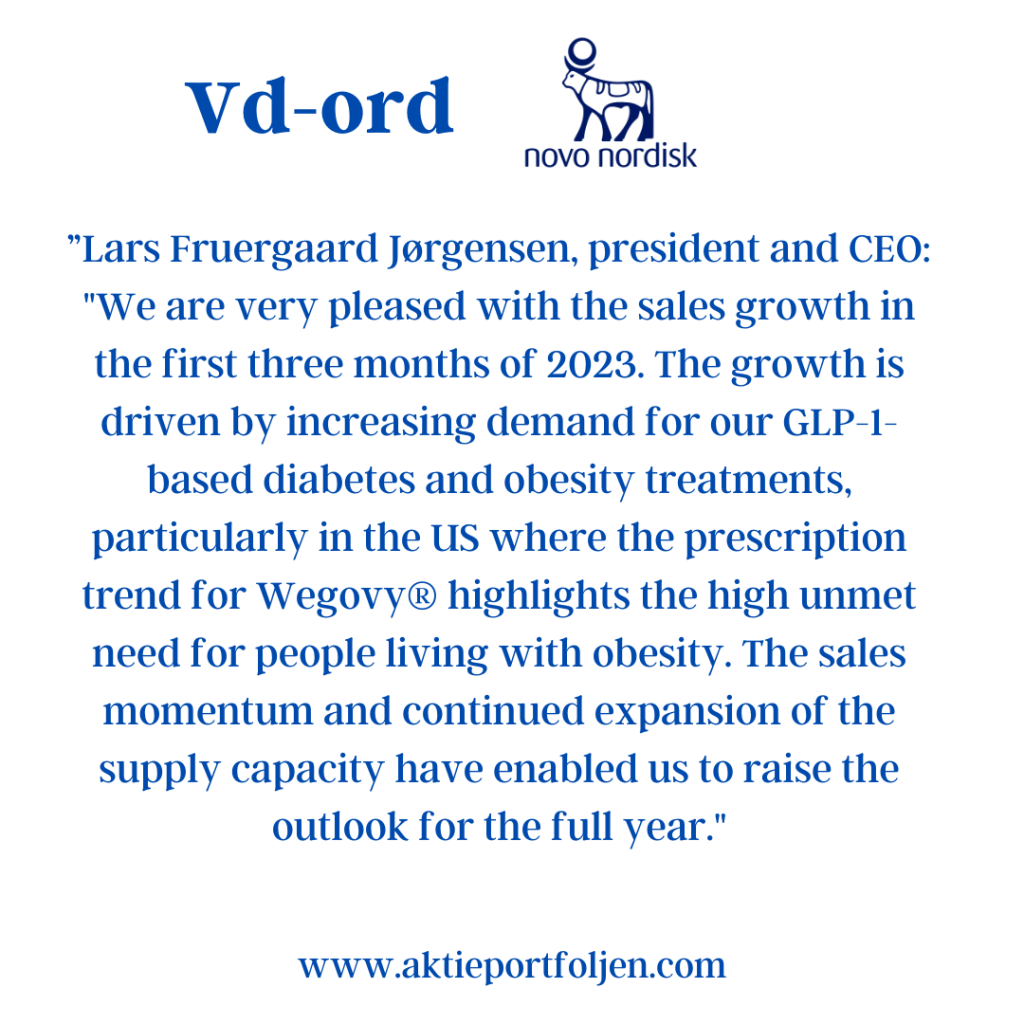 ”Lars Fruergaard Jørgensen, president and CEO: ”We are very pleased with the sales growth in the first three months of 2023. The growth is driven by increasing demand for our GLP-1-based diabetes and obesity treatments, particularly in the US where the prescription trend for Wegovy® highlights the high unmet need for people living with obesity. The sales momentum and continued expansion of the supply capacity have enabled us to raise the outlook for the full year.”