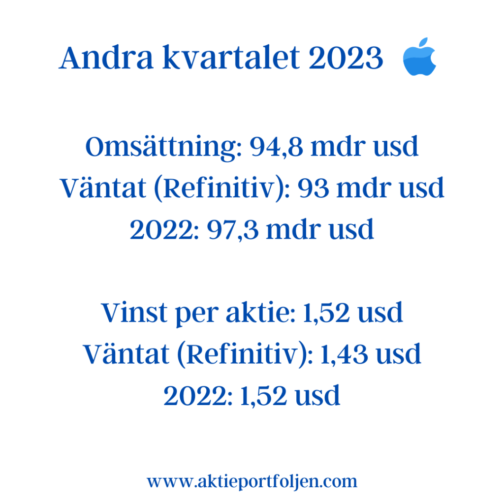 Apple, en långliggare och favorit i laguppställningen, redovisar omsättning och vinst som är bättre än förväntat. En aktie där jag har gjort flera små vinsthemtagningar på toppen genom åren. Kvartalsrapporten presenterades igår kväll efter stängning i New York och aktien steg +2,5% i efterhanden. I år är aktien upp +13% samt trendar med 9,7% över sitt MA200.
