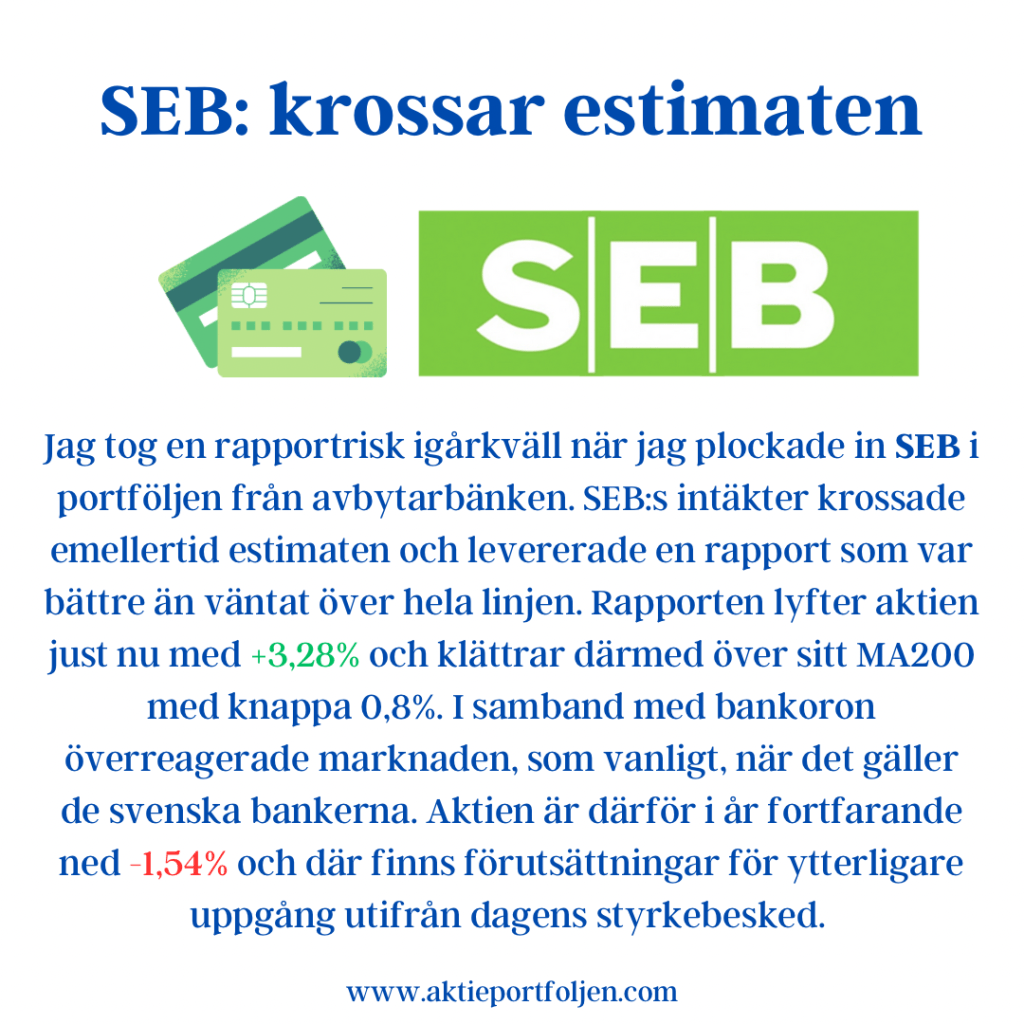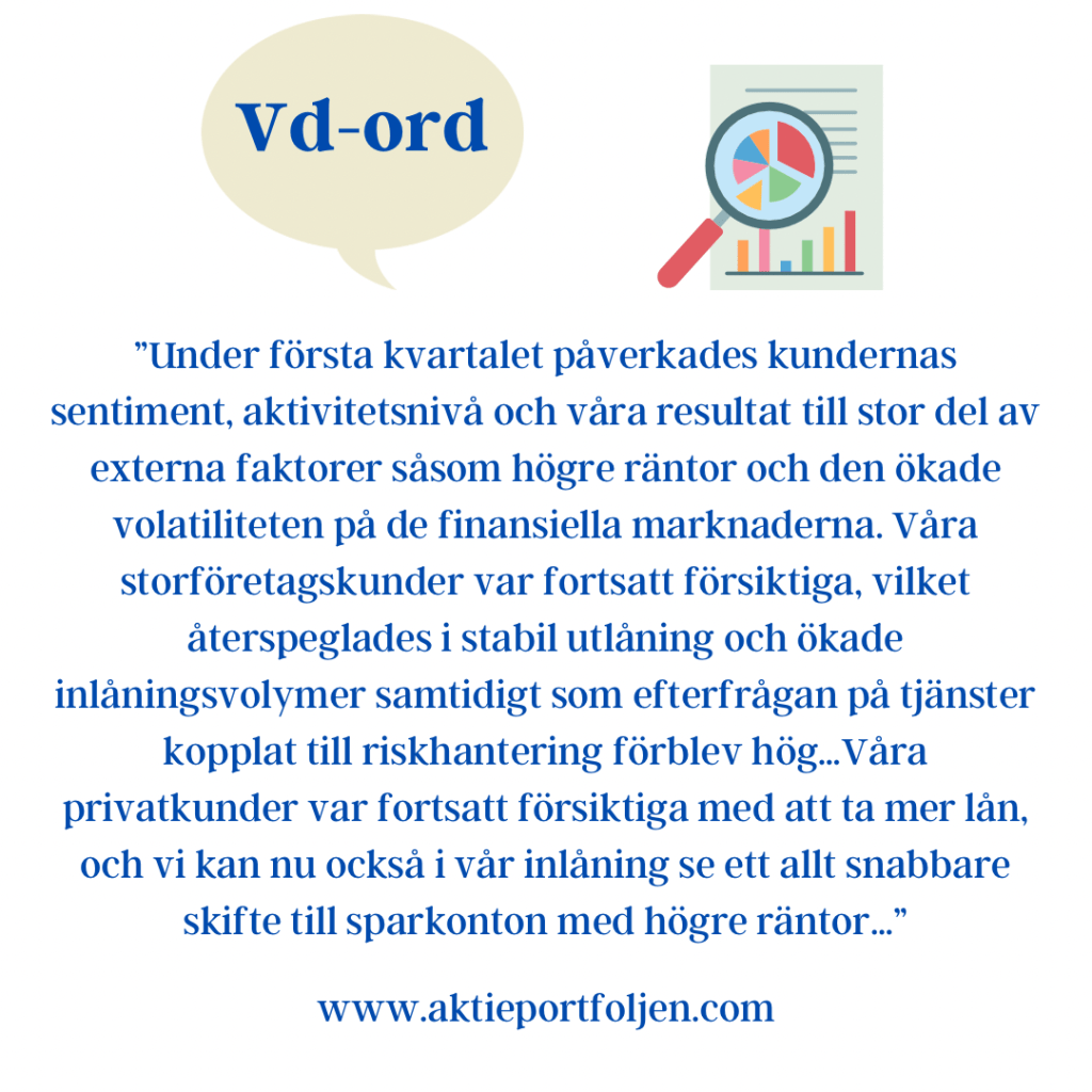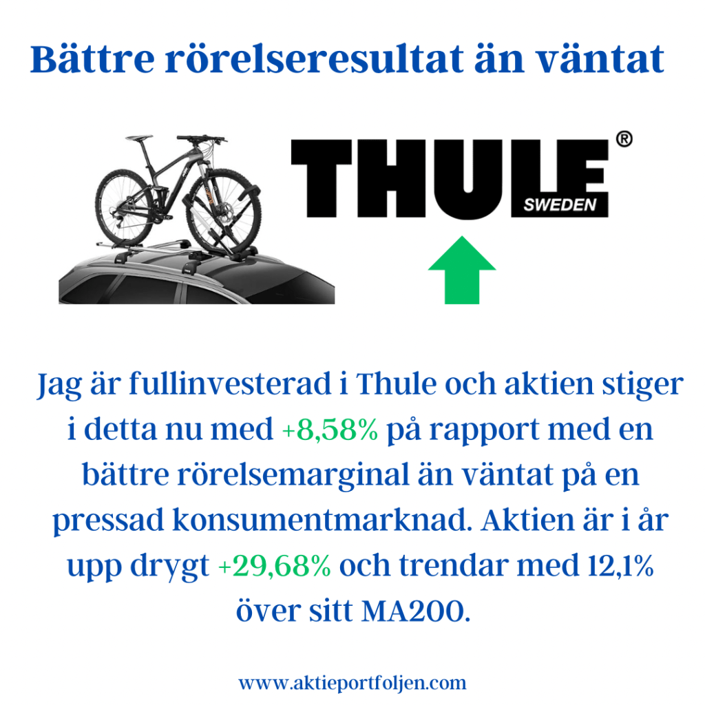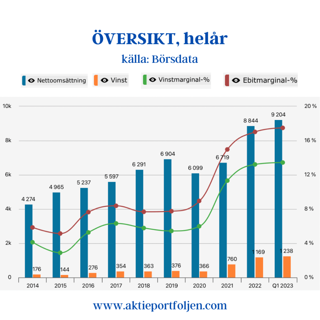Jag är fullinvesterad i Medcap och aktien stiger i detta nu med +2,76% på en rapport med kraftigt ökad tillväxt och justerad EBITDA. Aktien är redan i år upp drygt +25% och trendar starkt med 23% över sitt MA200. Försäljningen ökade med 45 procent, till 380,2 (262,8) MSEK under årets första kvartal. Tillväxten drevs delvis av förvärvet av AdderaCare, men även en stark organisk tillväxt i koncernens övriga bolag, vilket främst förklaras av nya produkter i marknaden, utlicensiering till fler marknader, samt en ökad efterfrågan på befintliga produkter. EBITDA ökade med 6 procent till 59,4 (56,3) 23,8 procent. MSEK under årets första kvartal. Justerad EBITDA, exklusive engångsposter, ökade med33 procent till 74,8 (56,3) MSEK. ”…För koncernen som helhet så är det främst ökad efterfrågan och volym som drivit försäljningsökningen, medan prisökningar har en mer begränsad påverkan eftersom flera av dotterbolagen säljer inom upphandlade avtal med fasta priser… Sammanfattningsvis levererade koncernen ett mycket starkt första kvartal och integrationen av förvärv genomfördes resolut. Vi är ödmjuka inför osäkerheten i den rådande konjunkturen som sannolikt kommer prägla 2023, men kan konstatera att koncernen hittills visat sig väl positionerad. MedCap besitter en nettokassa och stark balansräkning som möjliggör investeringar och fler förvärv. Vi för kontinuerlig dialog med bolag som skulle passa väl in och utvecklas inom MedCap- gruppen”.