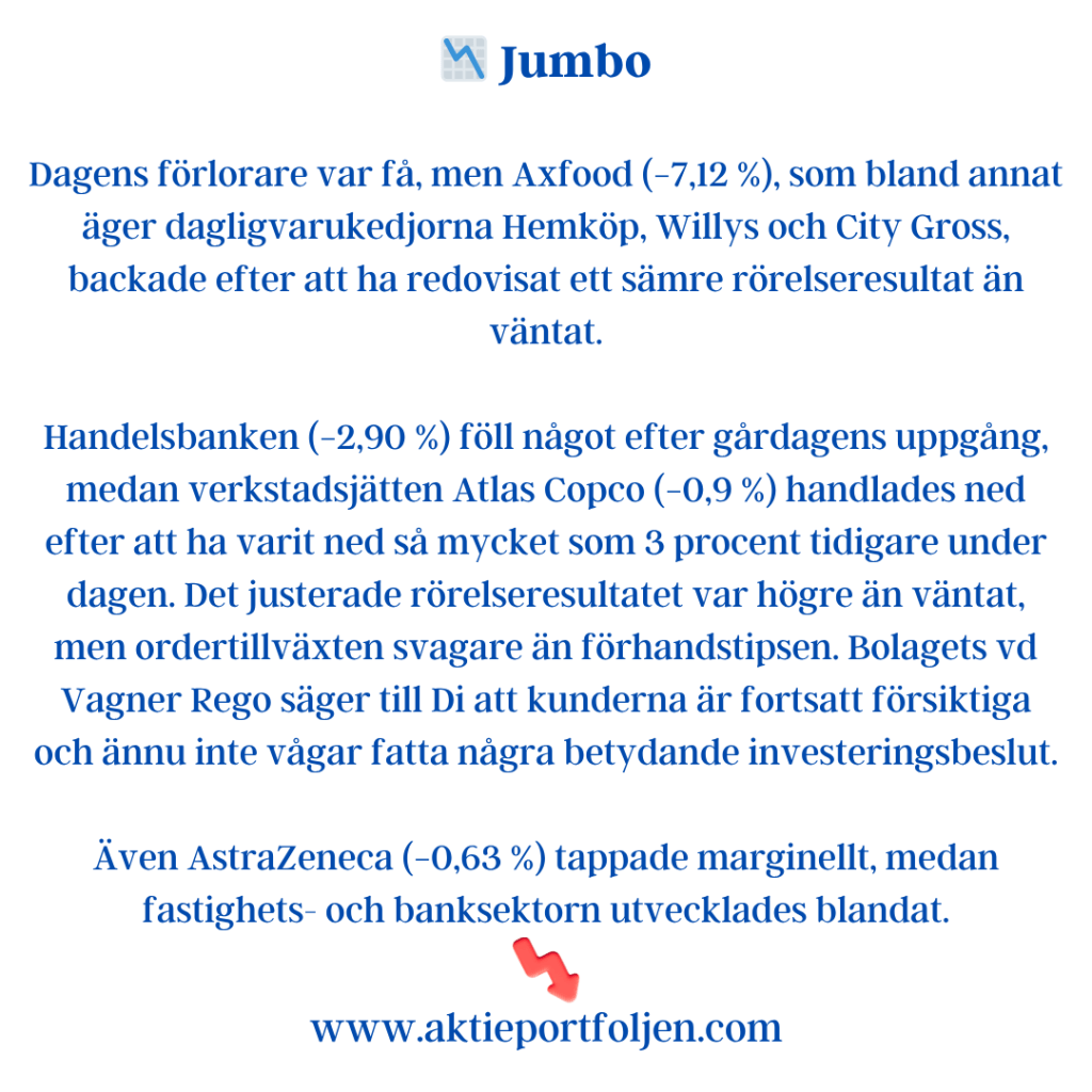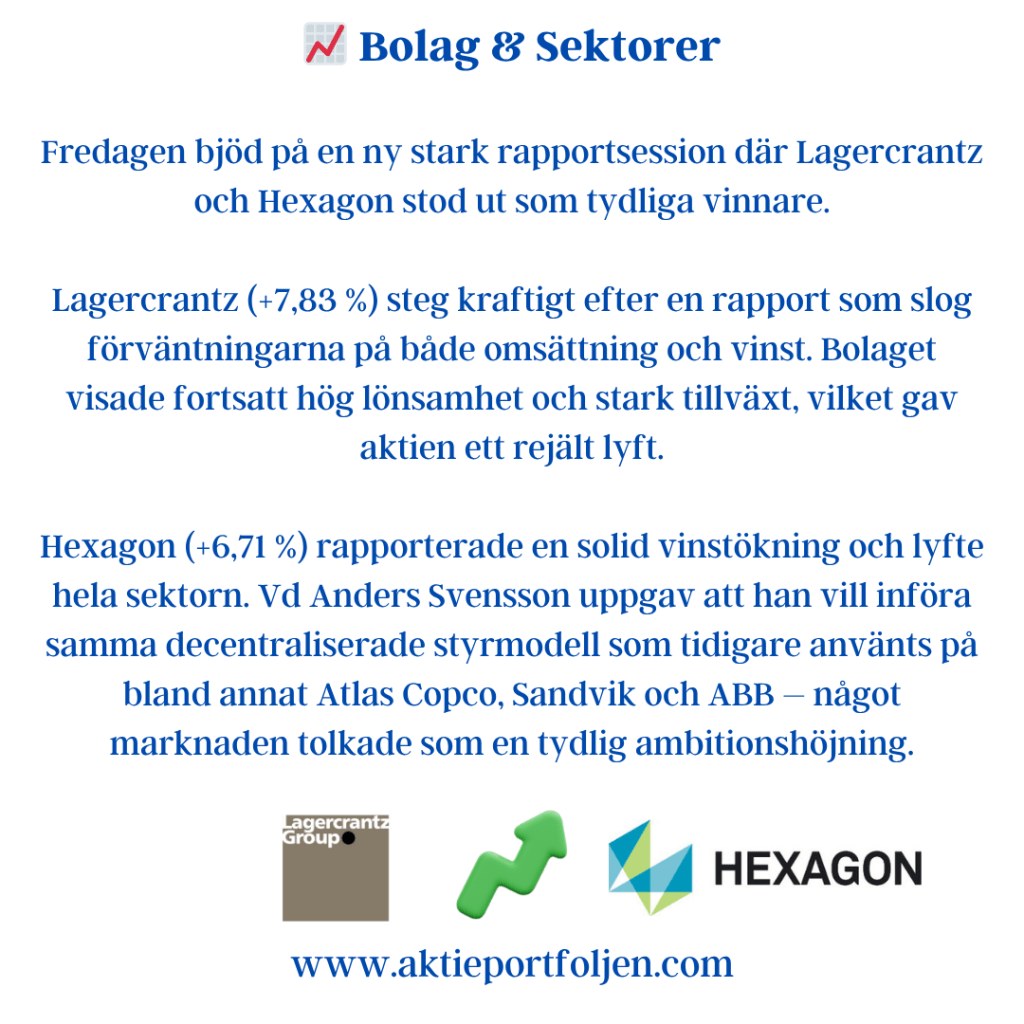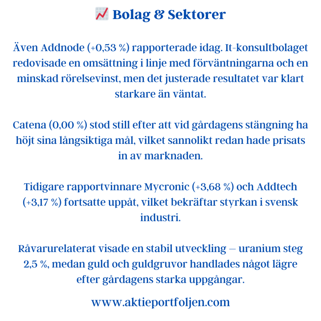 Latour (−3,2 %) backade efter sin rapport där substansvärdet sjönk 0,6 % under årets nio första månader, justerat för utdelning. Det kan jämföras med SIXRX-index som steg 5,8 % under samma period – en tydlig eftersläpning som pressade aktien.