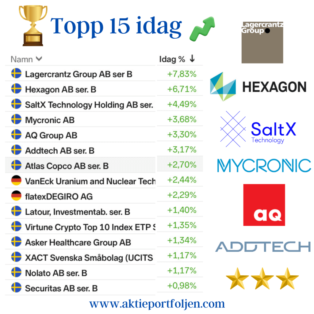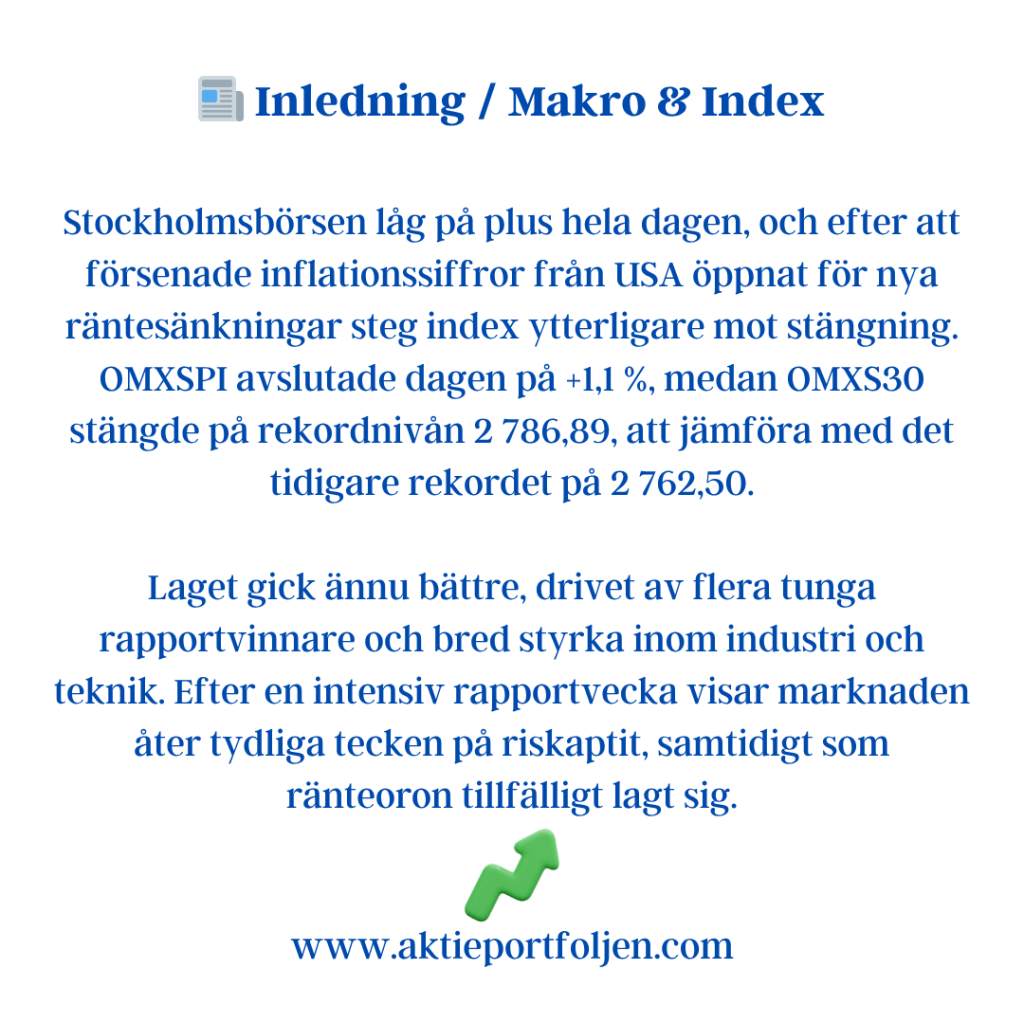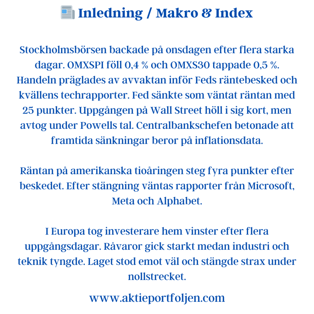 Latour (−3,2 %) backade efter sin rapport där substansvärdet sjönk 0,6 % under årets nio första månader, justerat för utdelning. Det kan jämföras med SIXRX-index som steg 5,8 % under samma period – en tydlig eftersläpning som pressade aktien.