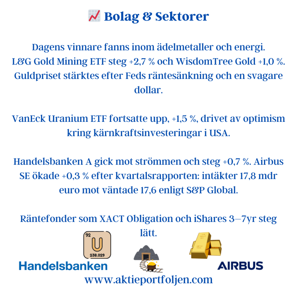 Handelsbanken (+0,8 %) och Xtrackers Financials ETF (+0,7 %) gick mot strömmen och bidrog till att stabilisera laget.