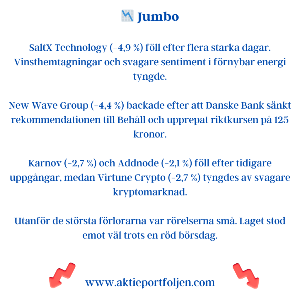 Allra sämst gick SaltX (−6,0 %) efter sin rapport på morgonen, där marknaden reagerade på uteblivna nyheter kring nya avtal och finansiering.