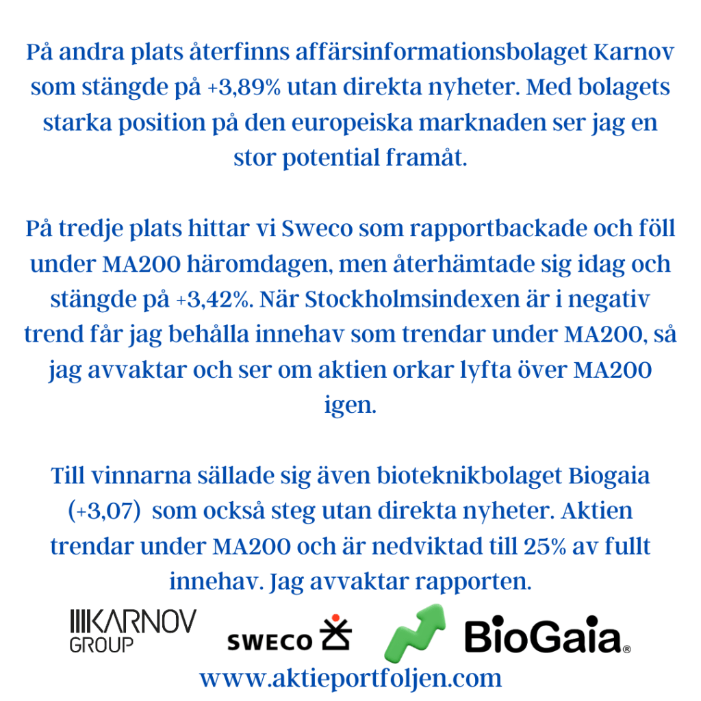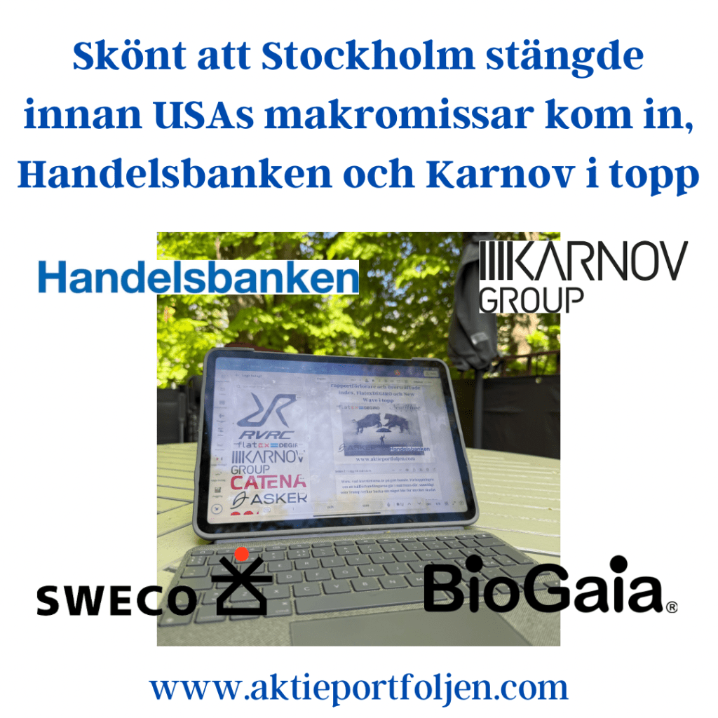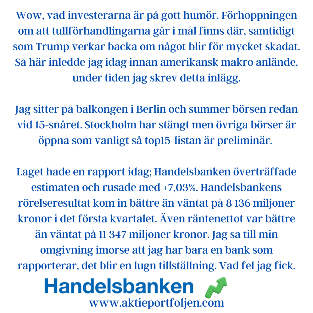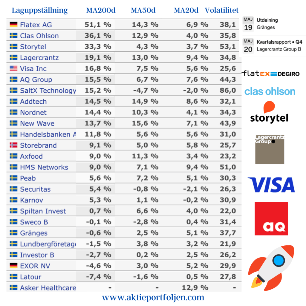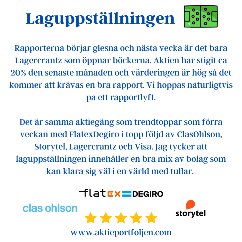 Det är samma aktiegäng som trendtoppar som förra veckan med FlatexDegiro i topp följd av ClasOhlson, Storytel, Lagercrantz och Visa. Jag tycker att laguppställningen innehåller en bra mix av bolag som kan klara sig väl i en värld med tullar.