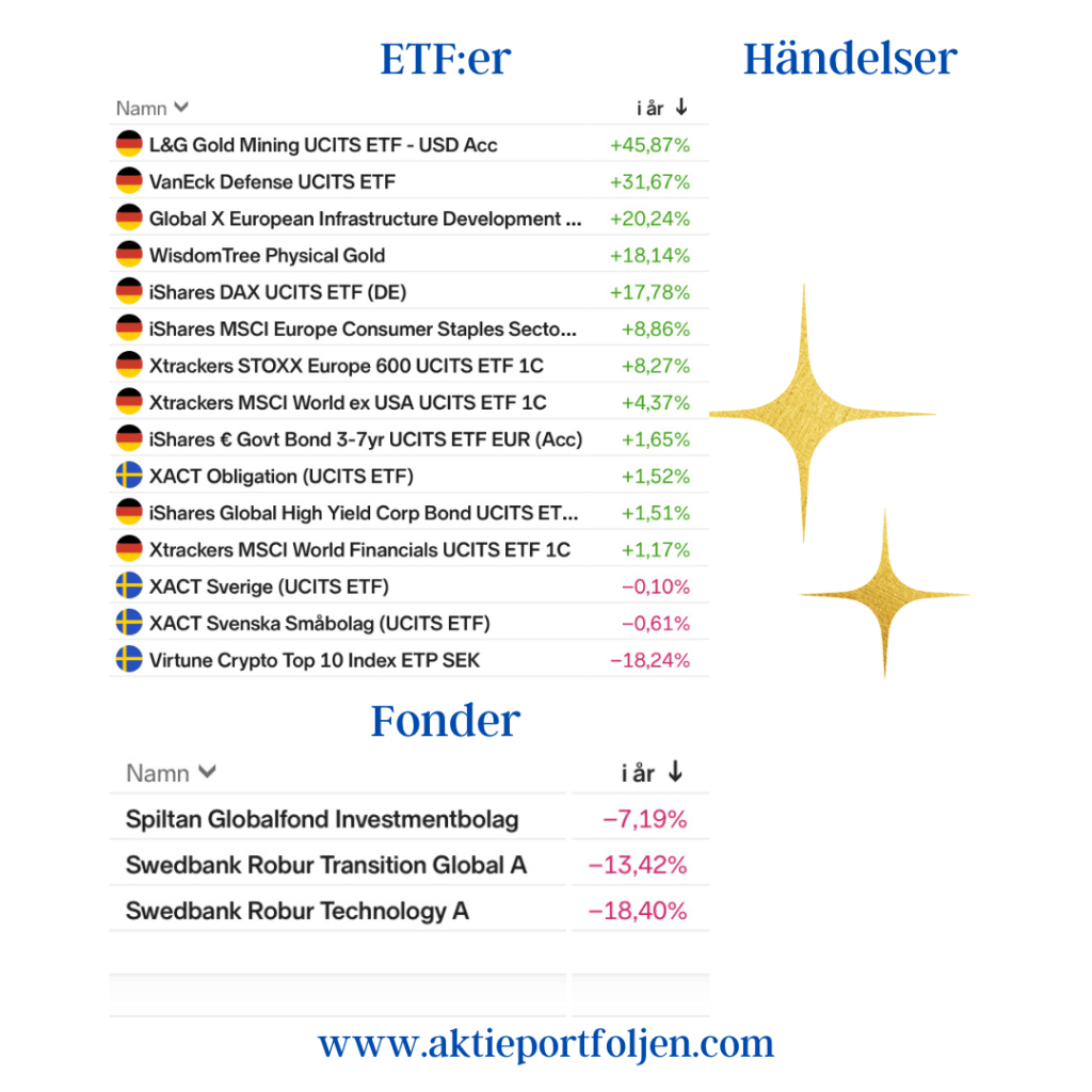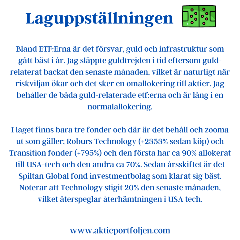Bland ETF:Erna är det försvar, guld och infrastruktur som gått bäst i år. Jag släppte guldtrejden i tid eftersom guld-relaterat backat den senaste månaden, vilket är naturligt när riskviljan ökar och det sker en omallokering till aktier. Jag behåller de båda guld-relaterade etf:erna och är lång i en normalallokering.
