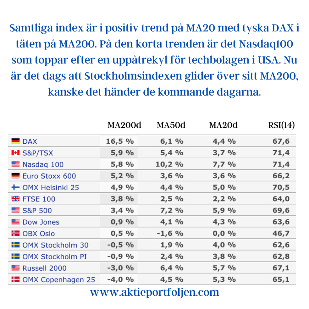 Samtliga index är i positiv trend på MA20 med tyska DAX i täten på MA200. På den korta trenden är det Nasdaq100 som toppar efter en uppåtrekyl för techbolagen i USA. Nu är det dags att Stockholmsindexen glider över sitt MA200, kanske det händer de kommande dagarna.
