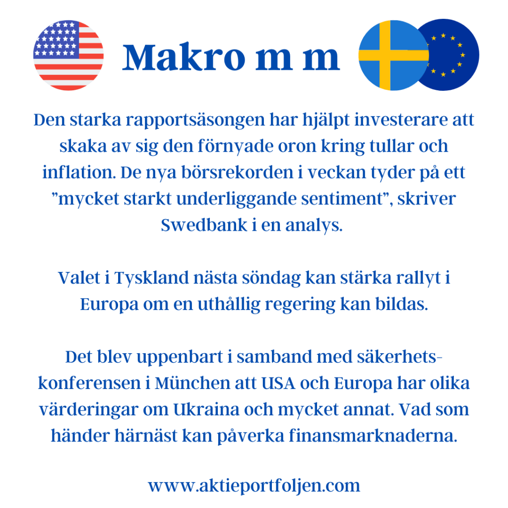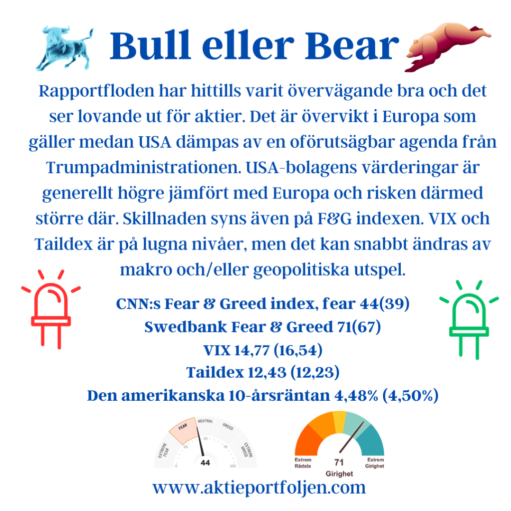 Rapportfloden har hittills varit övervägande bra och det ser lovande ut för aktier. Det är övervikt i Europa som gäller medan USA dämpas av en oförutsägbar agenda från Trumpadministrationen. USA-bolagens värderingar är generellt högre jämfört med Europa och risken därmed större där. Skillnaden syns även på F&G indexen. VIX och Taildex är på lugna nivåer, men det kan snabbt ändras av makro och/eller geopolitiska utspel.
