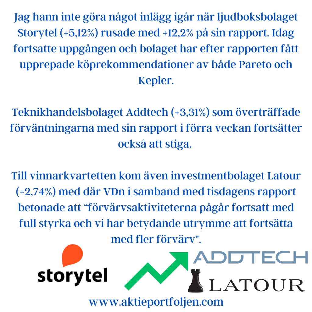 Rapportförlorare idag blev ljudboksbolaget Storytel (-18,36) och teknikkonsultbolaget Sweco (-6,78%). Båda lämnade bra rapporter men missade lite på estimaten, och båda straffades hårt. Jag är naturligtvis jävig men jag tycker att nedgången i Storytel var överdriven, säkert triggad av automatiserad handel. Jag som handlar manuellt tackar och tar emot och fyllde på innehavet med en fin prissänkning 🙂 Nedgången är inom ramen för positiv trend på MA200.