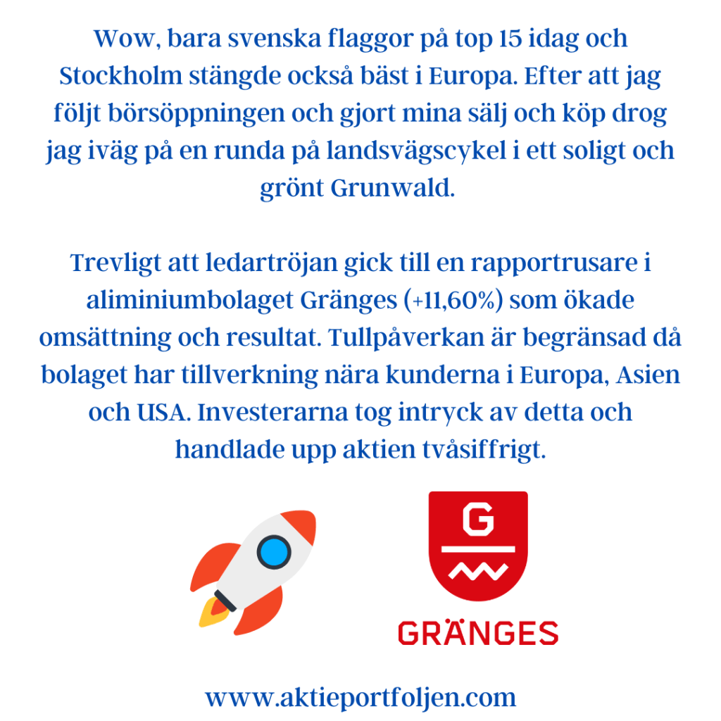 Trevligt att ledartröjan gick till en rapportrusare i aliminiumbolaget Gränges (+11,60%) som ökade omsättning och resultat. Tullpåverkan är begränsad då bolaget har tillverkning nära kunderna i Europa, Asien och USA. Investerarna tog intryck av detta och handlade upp aktien tvåsiffrigt.
