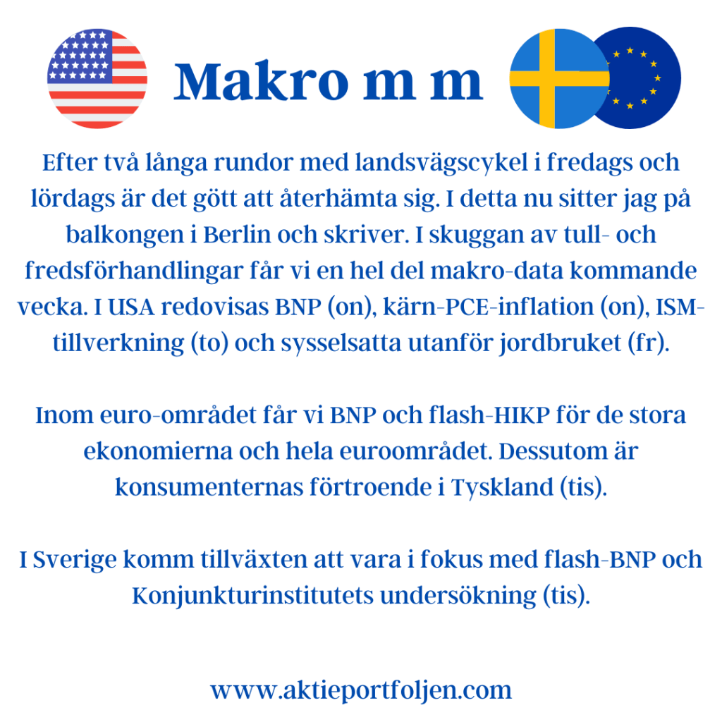 Efter två långa rundor med landsvägscykel i fredags och lördags är det gött att återhämta sig. I detta nu sitter jag på balkongen i Berlin och skriver. I skuggan av tull- och fredsförhandlingar får vi en hel del makro-data kommande vecka. I USA redovisas BNP (on), kärn-PCE-inflation (on), ISM-tillverkning (to) och sysselsatta utanför jordbruket (fr).