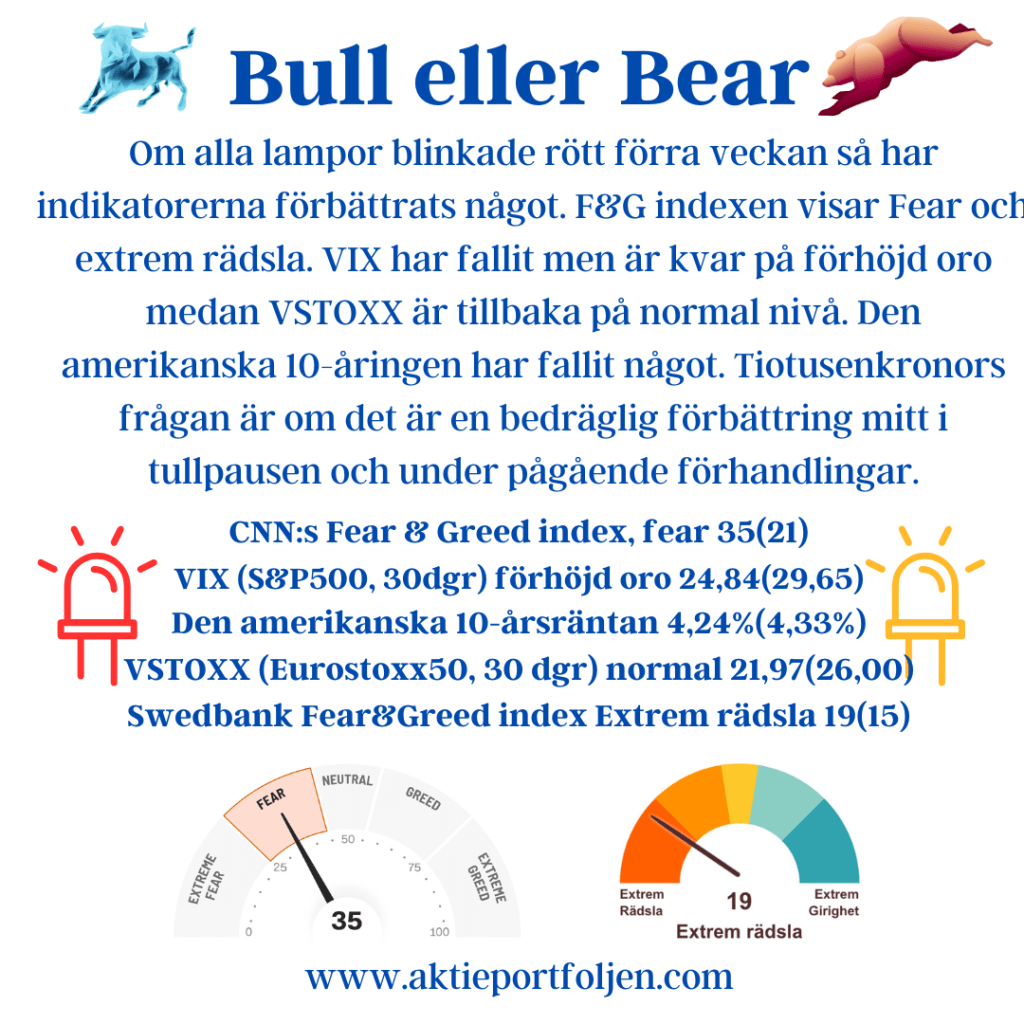 Om alla lampor blinkade rött förra veckan så har indikatorerna förbättrats något. F&G indexen visar Fear och extrem rädsla. VIX har fallit men är kvar på förhöjd oro medan VSTOXX är tillbaka på normal nivå. Den amerikanska 10-åringen har fallit något. Tiotusenkronors frågan är om det är en bedräglig förbättring mitt i tullpausen och under pågående förhandlingar.