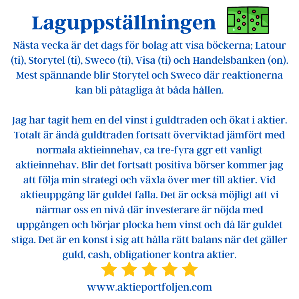 Nästa vecka är det dags för bolag att visa böckerna; Latour (ti), Storytel (ti), Sweco (ti), Visa (ti) och Handelsbanken (on). Mest spännande blir Storytel och Sweco där reaktionerna kan bli påtagliga åt båda hållen.