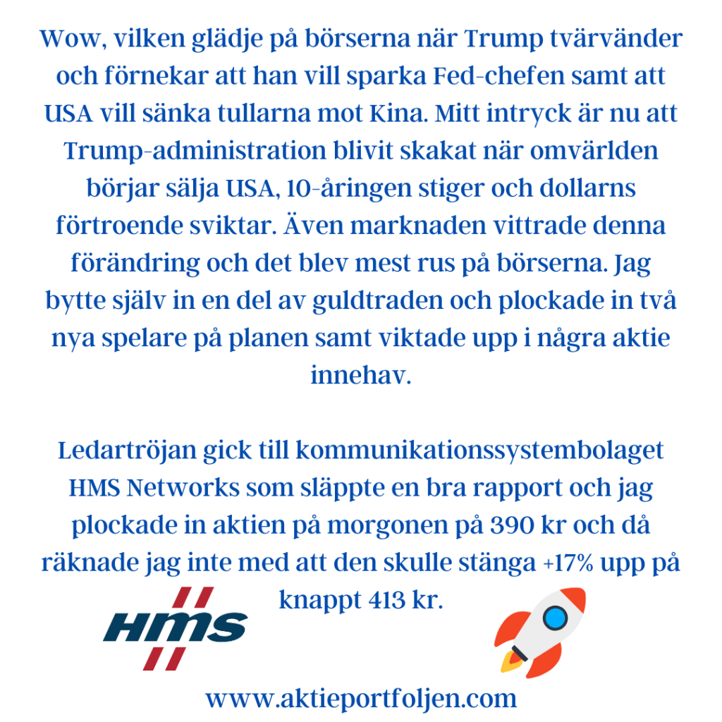 Wow, vilken glädje på börserna när Trump tvärvänder och förnekar att han vill sparka Fed-chefen samt att USA vill sänka tullarna mot Kina. Mitt intryck är nu att Trump-administration blivit skakat när omvärlden börjar sälja USA, 10-åringen stiger och dollarns förtroende sviktar. Även marknaden vittrade denna förändring och det blev mest rus på börserna. Jag bytte själv in en del av guldtraden och plockade in två nya spelare på planen samt viktade upp i några aktie innehav.