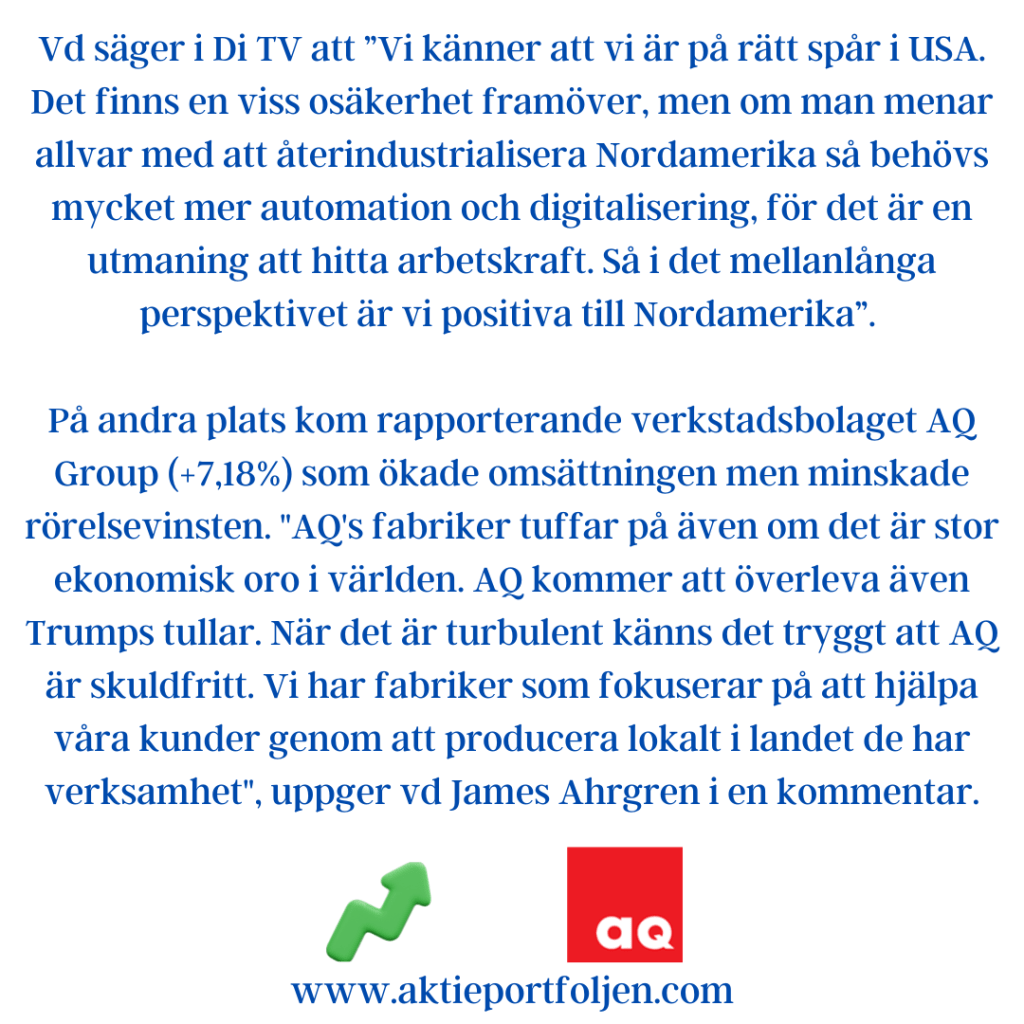På andra plats kom rapporterande verkstadsbolaget AQ Group (+7,18%) som ökade omsättningen men minskade rörelsevinsten. ”AQ’s fabriker tuffar på även om det är stor ekonomisk oro i världen. AQ kommer att överleva även Trumps tullar. När det är turbulent känns det tryggt att AQ är skuldfritt. Vi har fabriker som fokuserar på att hjälpa våra kunder genom att producera lokalt i landet de har verksamhet”, uppger vd James Ahrgren i en kommentar.