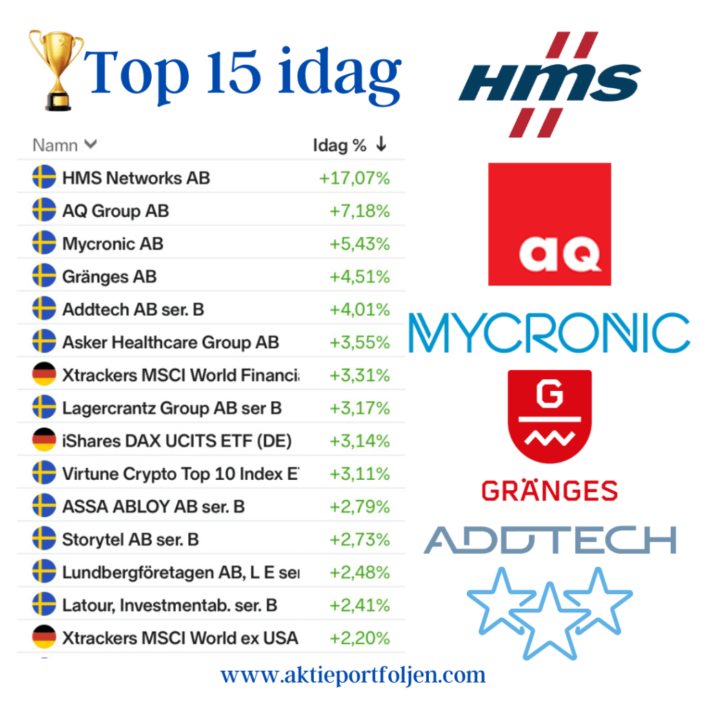 Ledartröjan gick till kommunikationssystembolaget HMS Networks som släppte en bra rapport och jag plockade in aktien på morgonen på 390 kr och då räknade jag inte med att den skulle stänga +17% upp på knappt 413 kr.