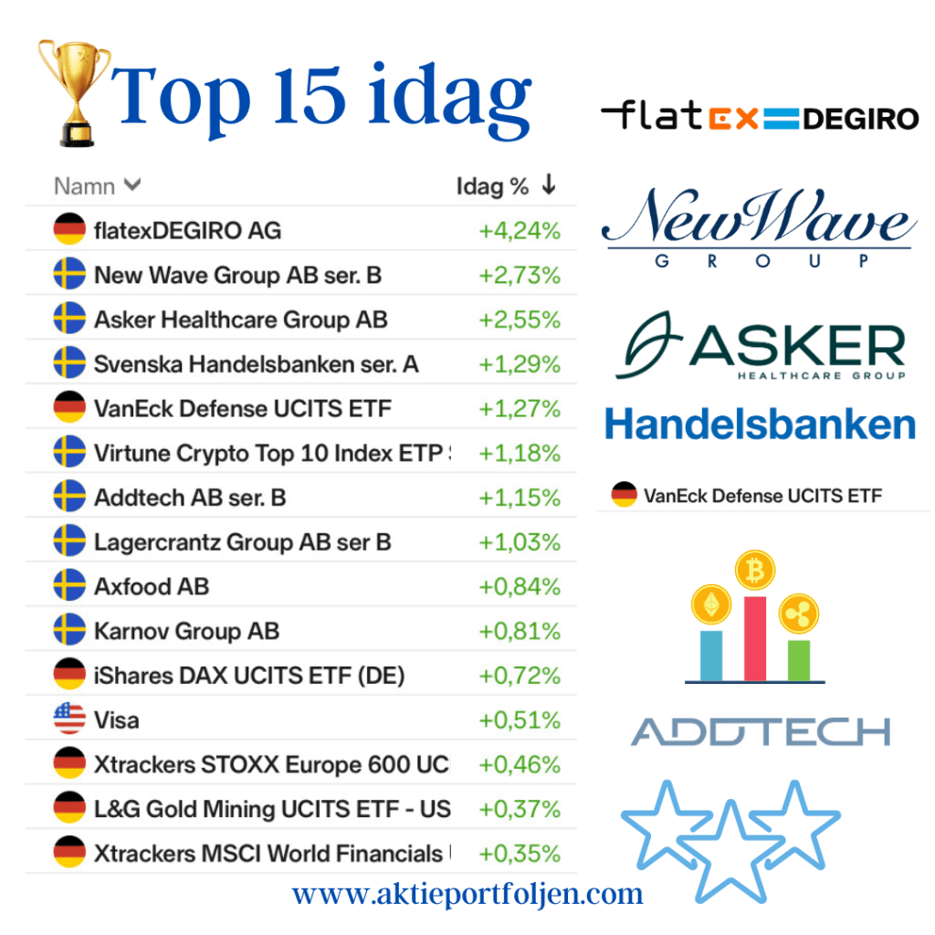 På tredje och fjärde plats hittar vi Asker healthcare (2,55%) och Handelsbanken (+1,29%) som båda stängde i topp utan direkta nyheter.