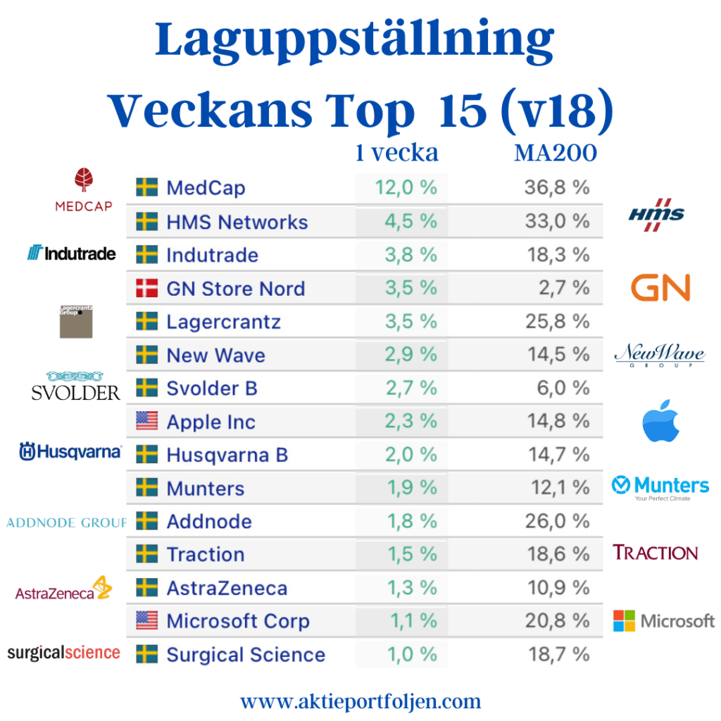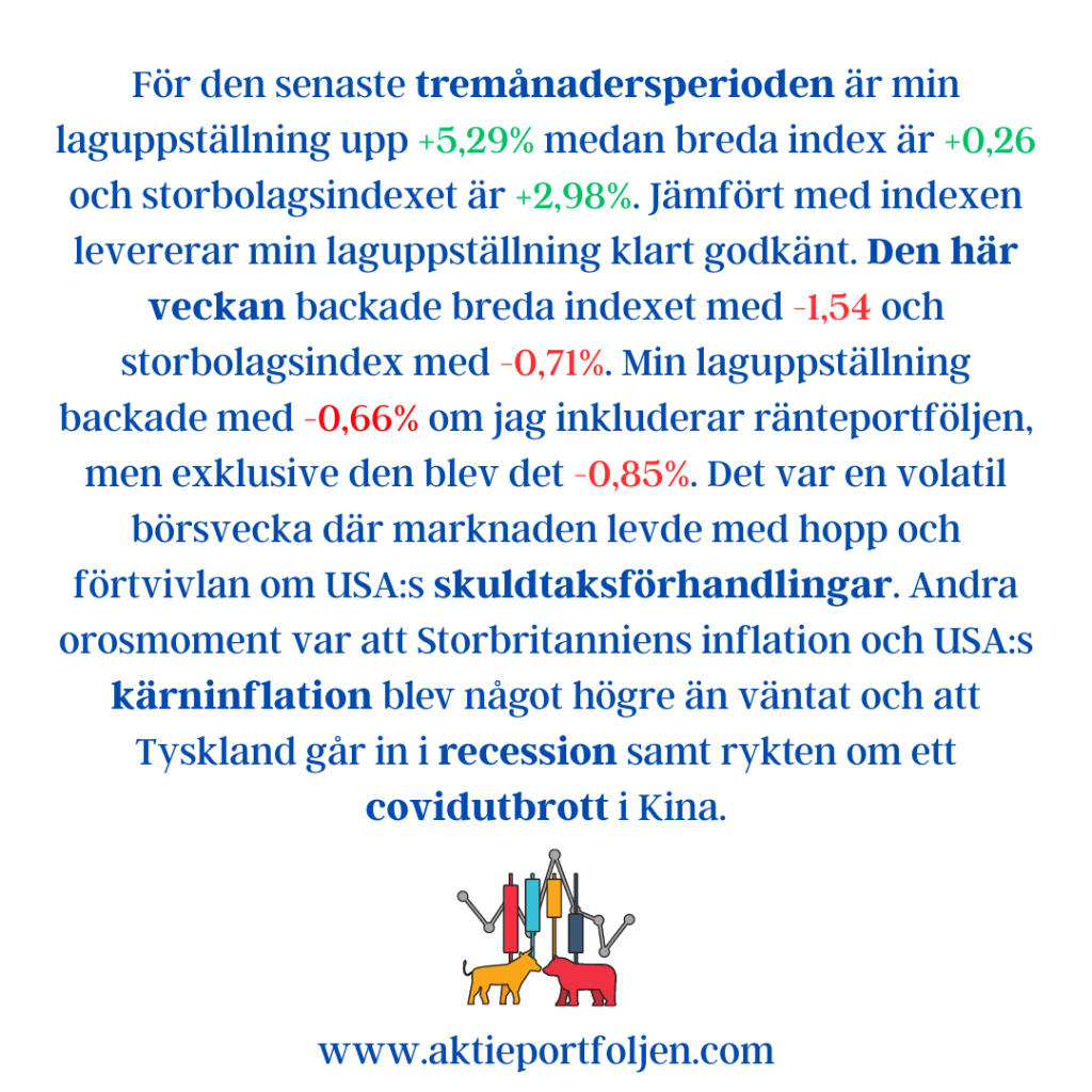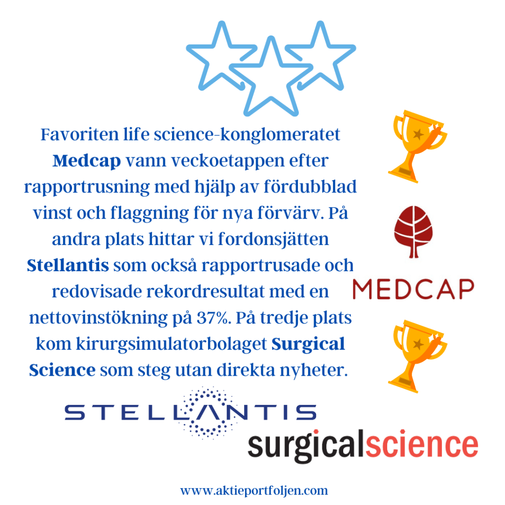 Laguppställningen levererade en fin vecka och överträffade båda Stockholmsindexen. Det blir några angenäma vinsthemtagningar kommande vecka för att allokera ned några rusare. Det kom flera bra makronyheter från USA, bl a fallande kärninflation. Har vi sett FED:s sista räntehöjning? I Sverige fick vi makrostatistik som indikerar att ekonomin bromsar in mer än väntat, bl a preliminär BNP-indikator. Vågar Riksbanken knäcka ekonomin mer med ytterligare räntehöjningar? Favoriten life science-konglomeratet Medcap vann veckoetappen efter rapportrusning med hjälp av fördubblad vinst och flaggning för nya förvärv. På andra plats hittar vi fordonsjätten Stellantis som också rapportrusade och redovisade rekordresultat med en nettovinstökning på 37%. På tredje plats kom kirurgsimulatorbolaget Surgical Science som steg utan direkta nyheter.