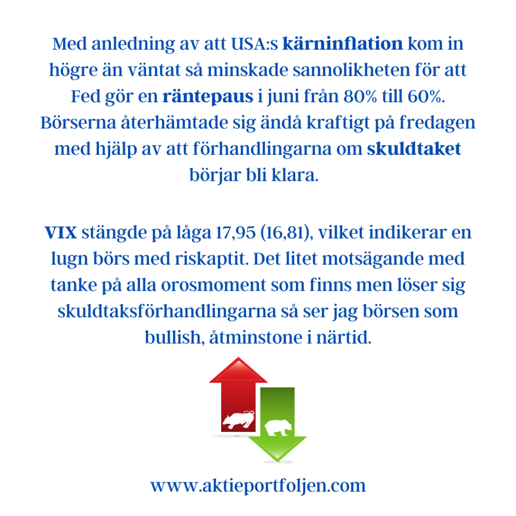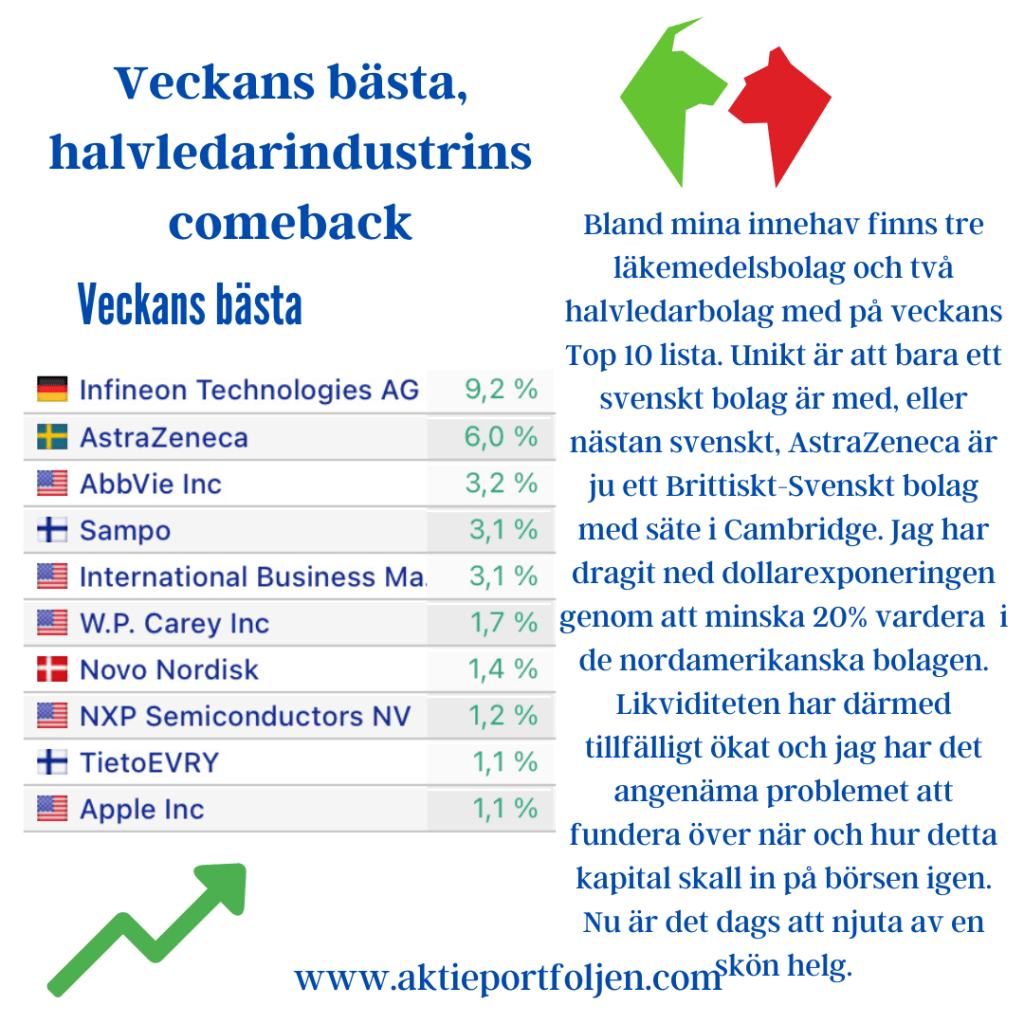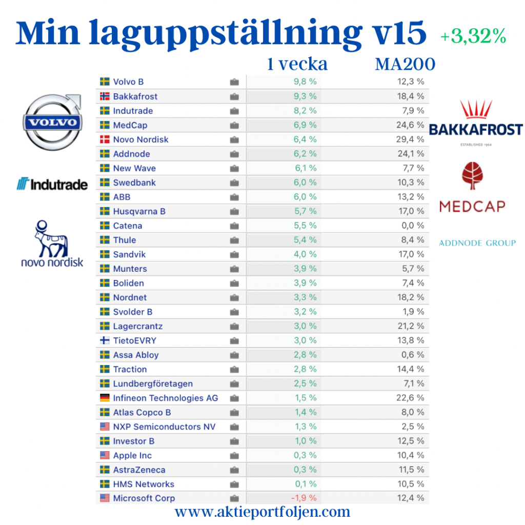 Laguppställningen levererade en fin vecka och överträffade båda Stockholmsindexen. Det blir några angenäma vinsthemtagningar kommande vecka för att allokera ned några rusare. Det kom flera bra makronyheter från USA, bl a fallande kärninflation. Har vi sett FED:s sista räntehöjning? I Sverige fick vi makrostatistik som indikerar att ekonomin bromsar in mer än väntat, bl a preliminär BNP-indikator. Vågar Riksbanken knäcka ekonomin mer med ytterligare räntehöjningar? Favoriten life science-konglomeratet Medcap vann veckoetappen efter rapportrusning med hjälp av fördubblad vinst och flaggning för nya förvärv. På andra plats hittar vi fordonsjätten Stellantis som också rapportrusade och redovisade rekordresultat med en nettovinstökning på 37%. På tredje plats kom kirurgsimulatorbolaget Surgical Science som steg utan direkta nyheter.