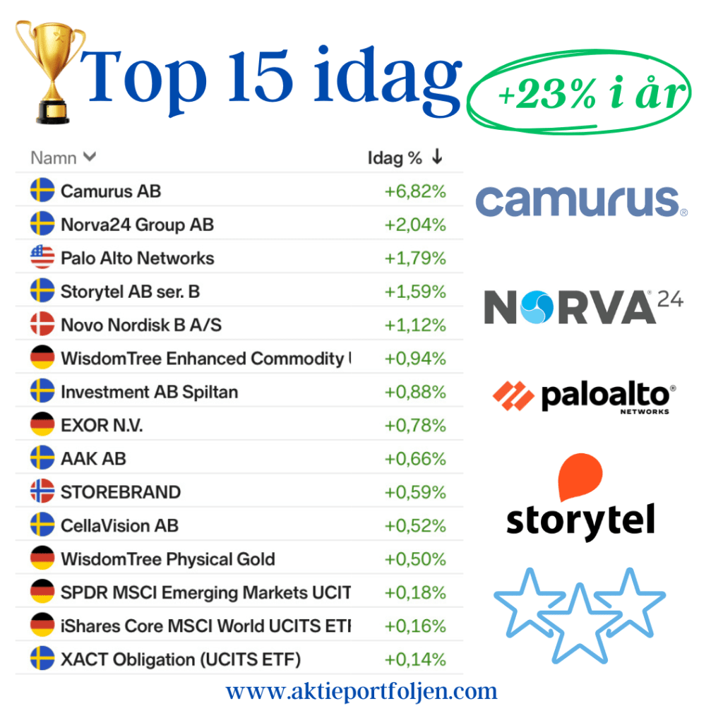 Efter en dryg mils löpning i Berlins parker är det skönt medatt en dusch och lite mat och att sätta sig att summera börsen. Det blir ju inte sämre när man ser att laguppställningen skött sig väl och stängt på gröna sidan när Stockholmsindexen stängde rött på omkring -0,60. Nu ska man inte ropa hej ännu för att det är fyra USA innehav på Top 15 och Wall Street stänger inte förrän kl 22.