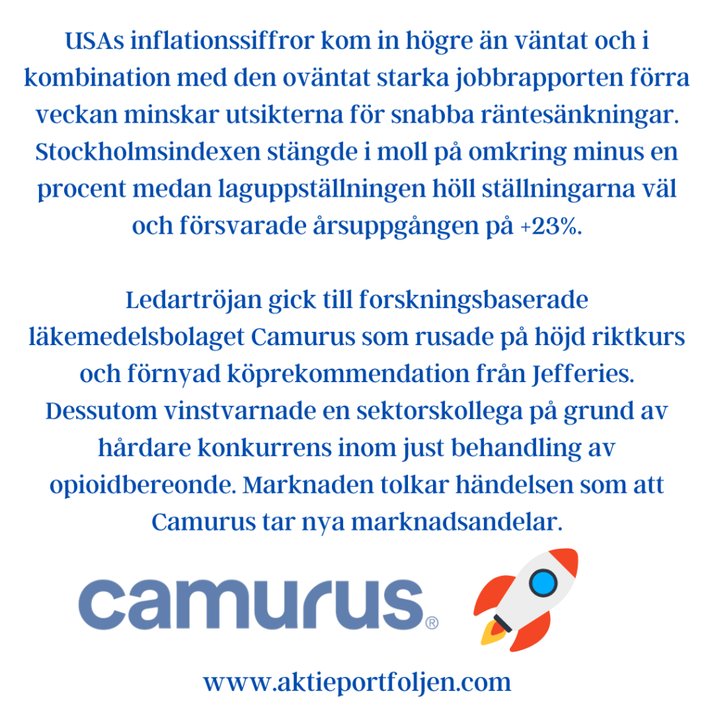 USAs inflationssiffror kom in högre än väntat och i kombination med den oväntat starka jobbrapporten förra veckan minskar utsikterna för snabba räntesänkningar. Stockholmsindexen stängde i moll på omkring minus en procent medan laguppställningen höll ställningarna väl och försvarade årsuppgången på +23%.