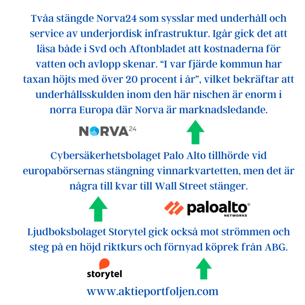 Klimatkontrollbolaget Munters stänger på andra plats och är en av de aktier som har gått bäst efter den senaste kvartalsrapporten. Idag kan jag inte hitta någon orsak till uppgången mer att att AI relaterat stiger på Wall Street. Munters levererar kylning till datacenters.