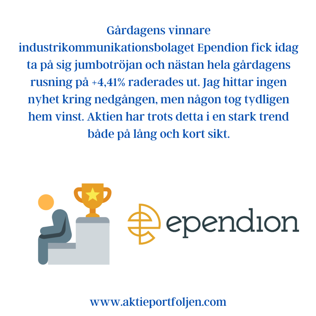 Gårdagens vinnare industrikommunikationsbolaget Ependion fick idag ta på sig jumbotröjan och nästan hela gårdagens rusning på +4,41% raderades ut. Jag hittar ingen nyhet kring nedgången, men någon tog tydligen hem vinst. Aktien har trots detta i en stark trend både på lång och kort sikt.