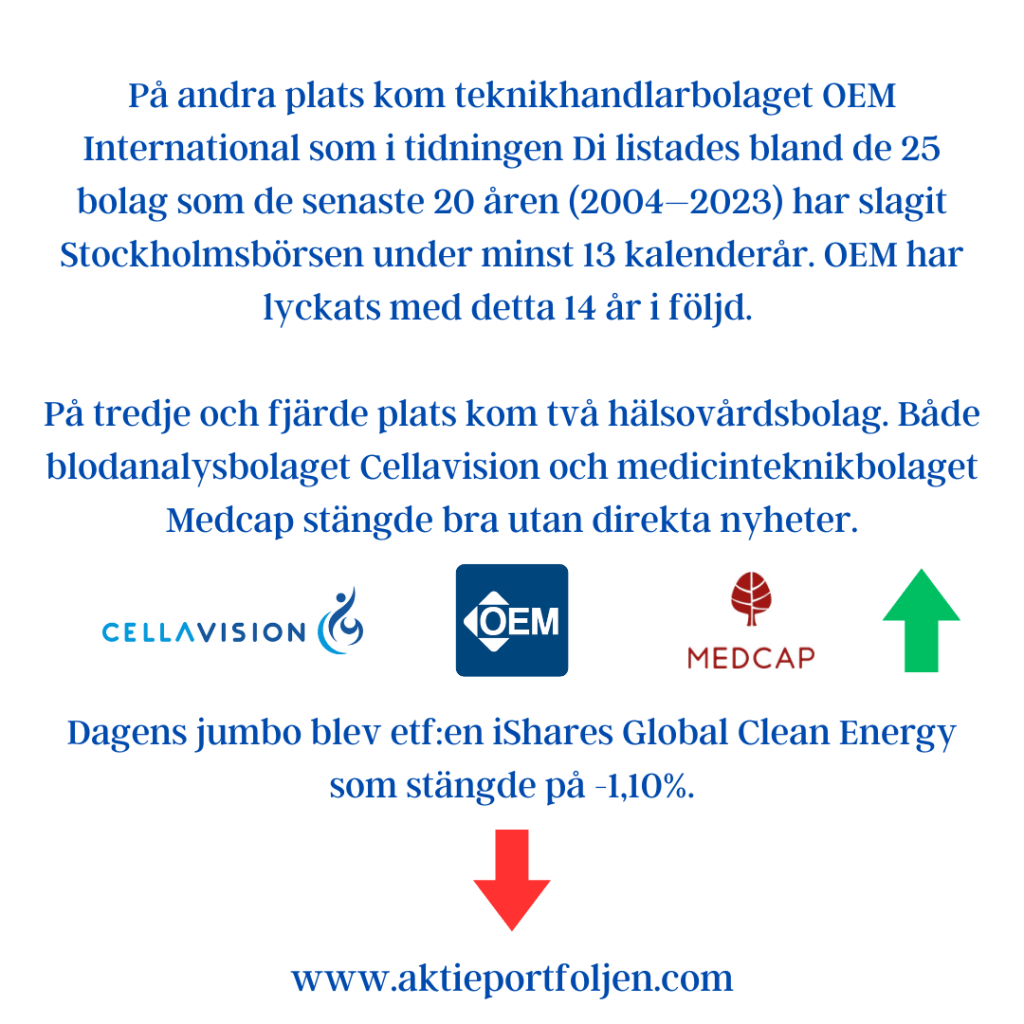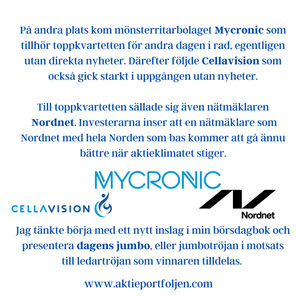 Laguppställningens dilemma är läkemedelsjätten Novo Nordisk som för drygt en vecka sedan föll under MA200. Jag har viktat ned och gjort vinsthemtagningar och har nu nästan halverat innehavet. Novo är ett angenämt problem eftersom aktien är upp 120% sedan köp. Däremot borde jag sålt allt innehav tidigare och tagit hem hela vinsten snabbare. Så kan det kan gå när man inte följer sin regelbok och har för stort överseende med en favoritaktie 🙂