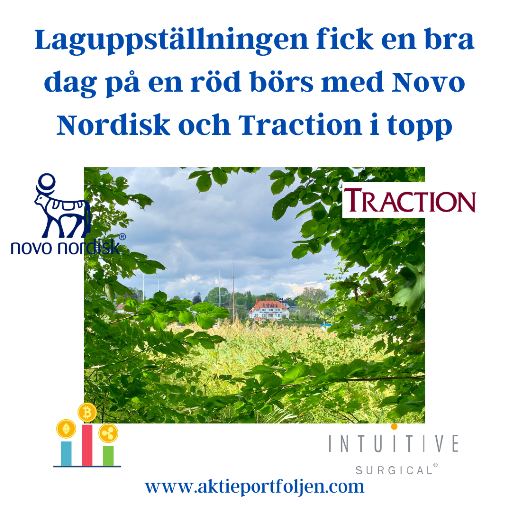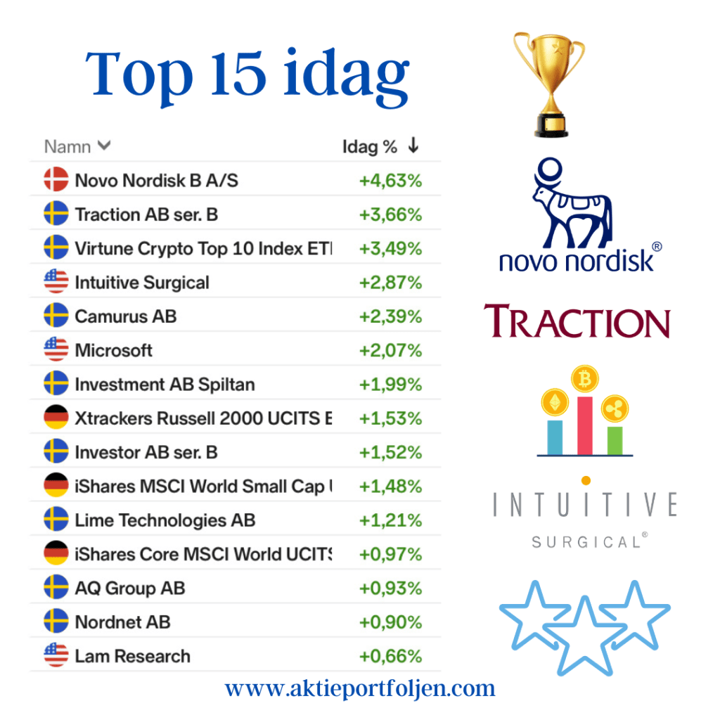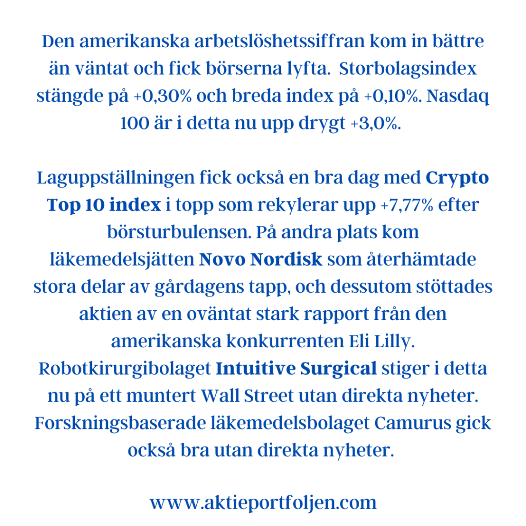 Laguppställningen fick också en bra dag med Crypto Top 10 index i topp som rekylerar upp +7,77% efter börsturbulensen. På andra plats kom läkemedelsjätten Novo Nordisk som återhämtade stora delar av gårdagens tapp, och dessutom stöttades aktien av en oväntat stark rapport från den amerikanska konkurrenten Eli Lilly. Robotkirurgibolaget Intuitive Surgical stiger i detta nu på ett muntert Wall Street utan direkta nyheter. Forskningsbaserade läkemedelsbolaget Camurus gick också bra utan direkta nyheter.