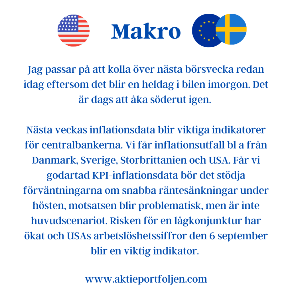 Jag passar på att kolla över nästa börsvecka redan idag eftersom det blir en heldag i bilen imorgon. Det är dags att åka söderut igen.